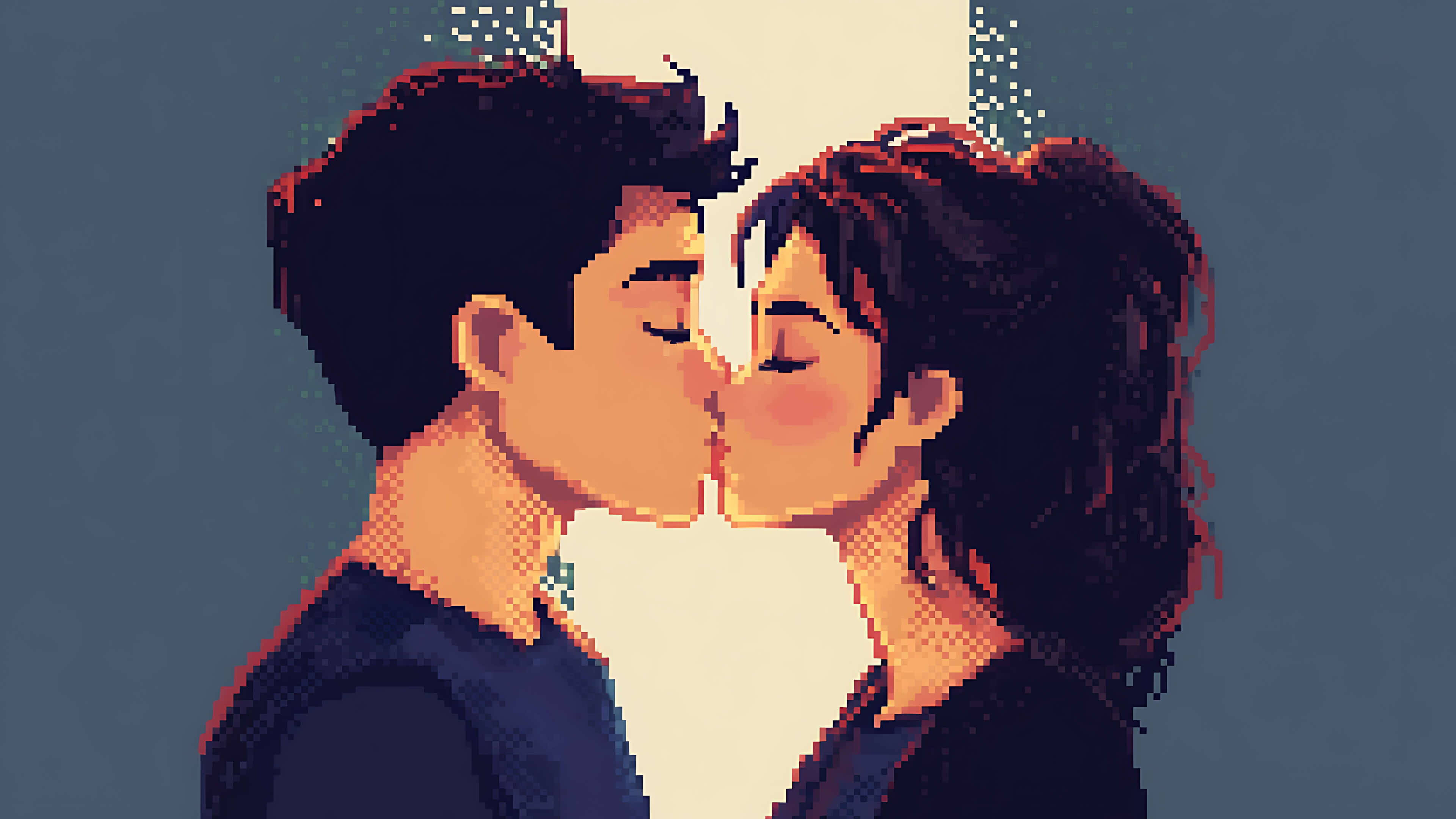 Pixelated artwork of a young couple kissing with their eyes closed, highlighted by a warm glow in the background, evoking a soft and romantic atmosphere.