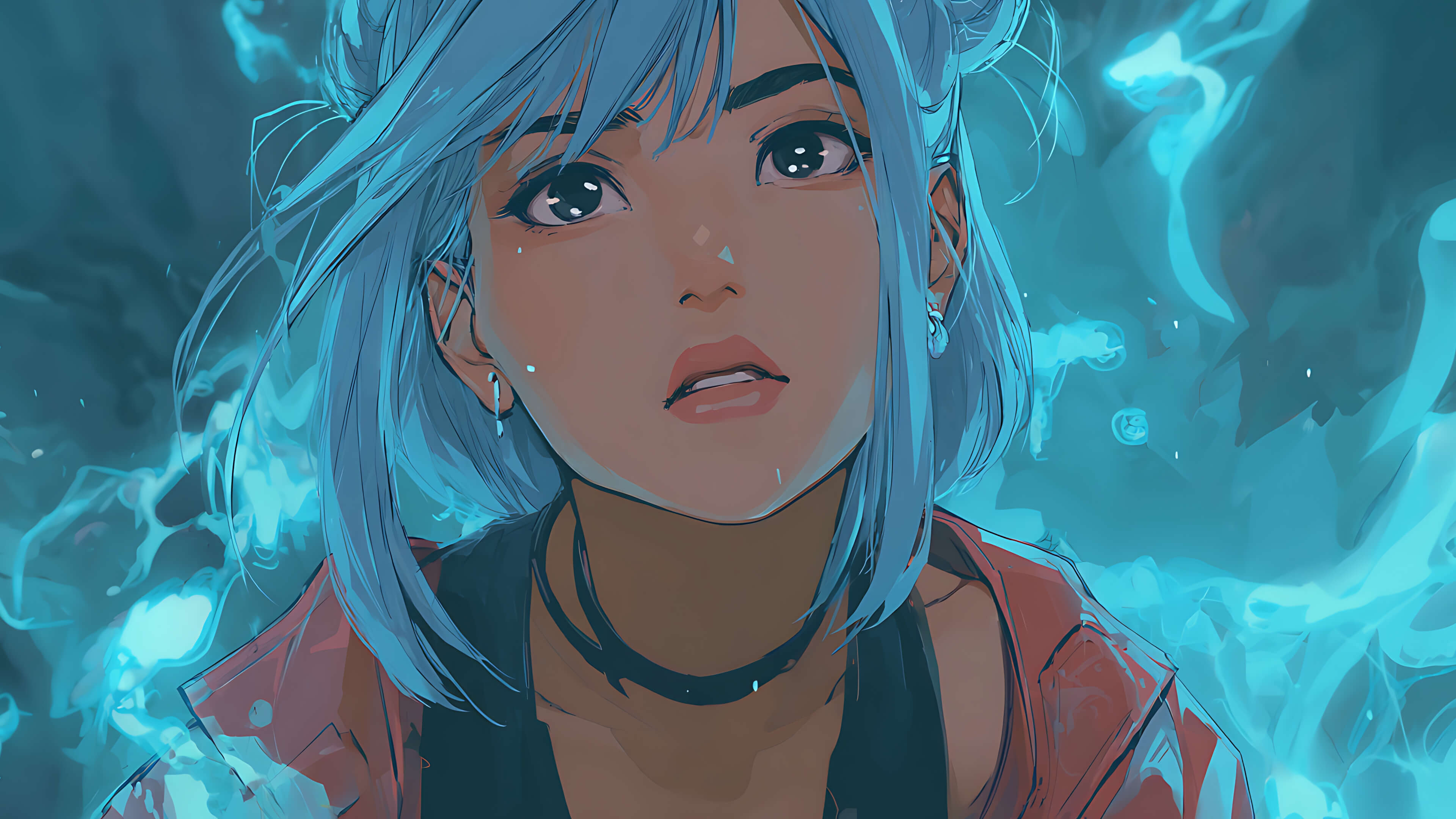 Close-up anime portrait of a girl with blue hair and glowing blue flames surrounding her, with a shocked and emotional expression.