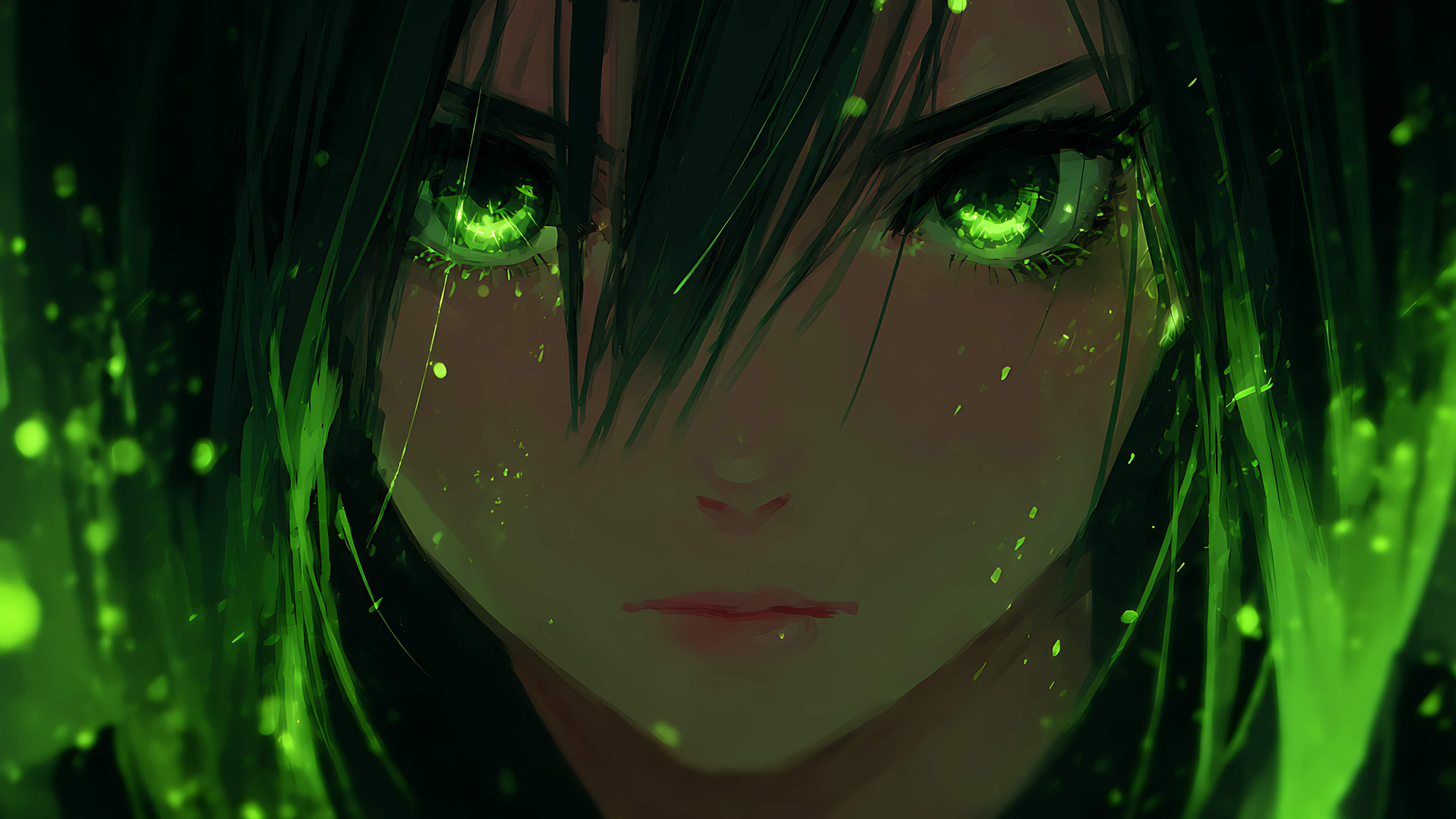 A close-up of an anime girl with deep green and black hair, her eyes ablaze with a glowing neon green energy. Her piercing gaze exudes power and emotion, hinting at an unstoppable force awakening within her. Glowing green particles swirl around her, emphasizing the magical or supernatural transformation taking place. The lighting and shadows cast a dramatic tone, evoking both beauty and danger in perfect balance.