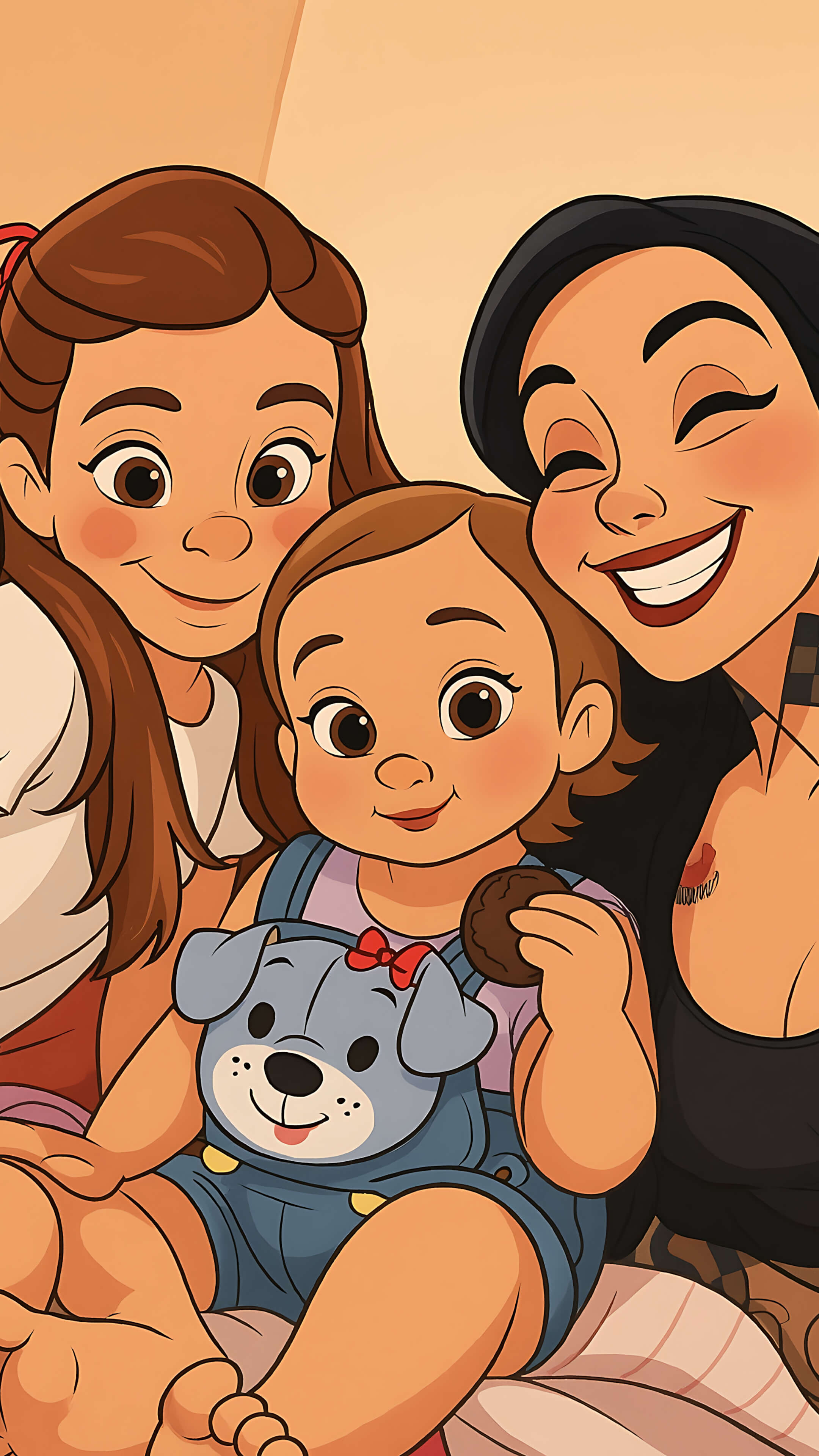 A sweet and heartwarming cartoon portrait of a mother and her two young daughters sitting close together and smiling. The toddler in the center holds a cookie, wearing cute overalls with a puppy face design, while the older sister and mother lovingly lean in for the photo. The image radiates affection and joyful family bonding in a cozy setting.