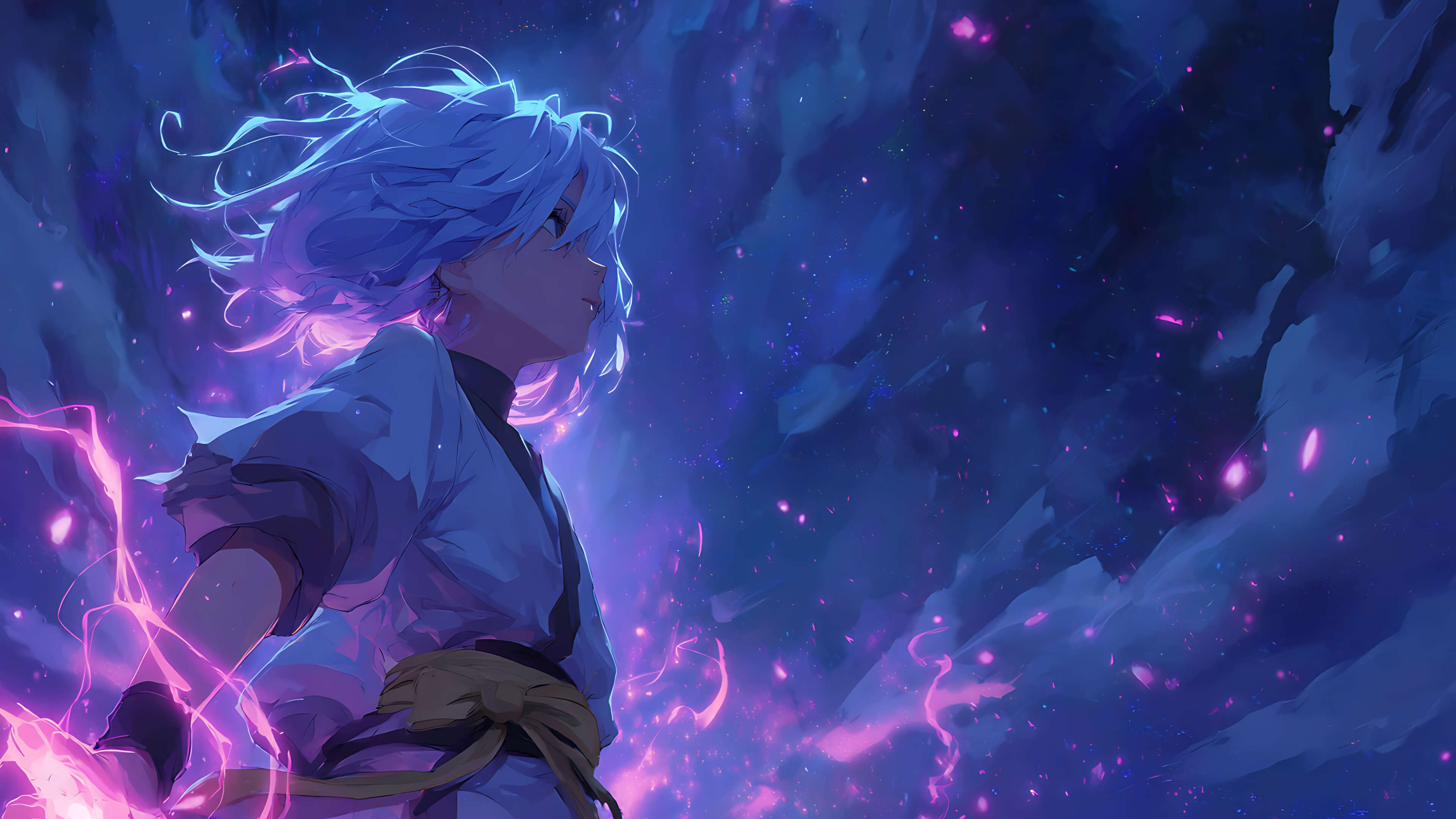 An anime warrior with glowing white hair stands poised against a cosmic sky filled with violet energy and stardust. Their clenched fist radiates with crackling pink lightning as they face the vast unknown with quiet strength and resolve. With a traditional martial robe and a backdrop resembling a galactic nebula, the scene feels like the fusion of ancient wisdom and otherworldly power.