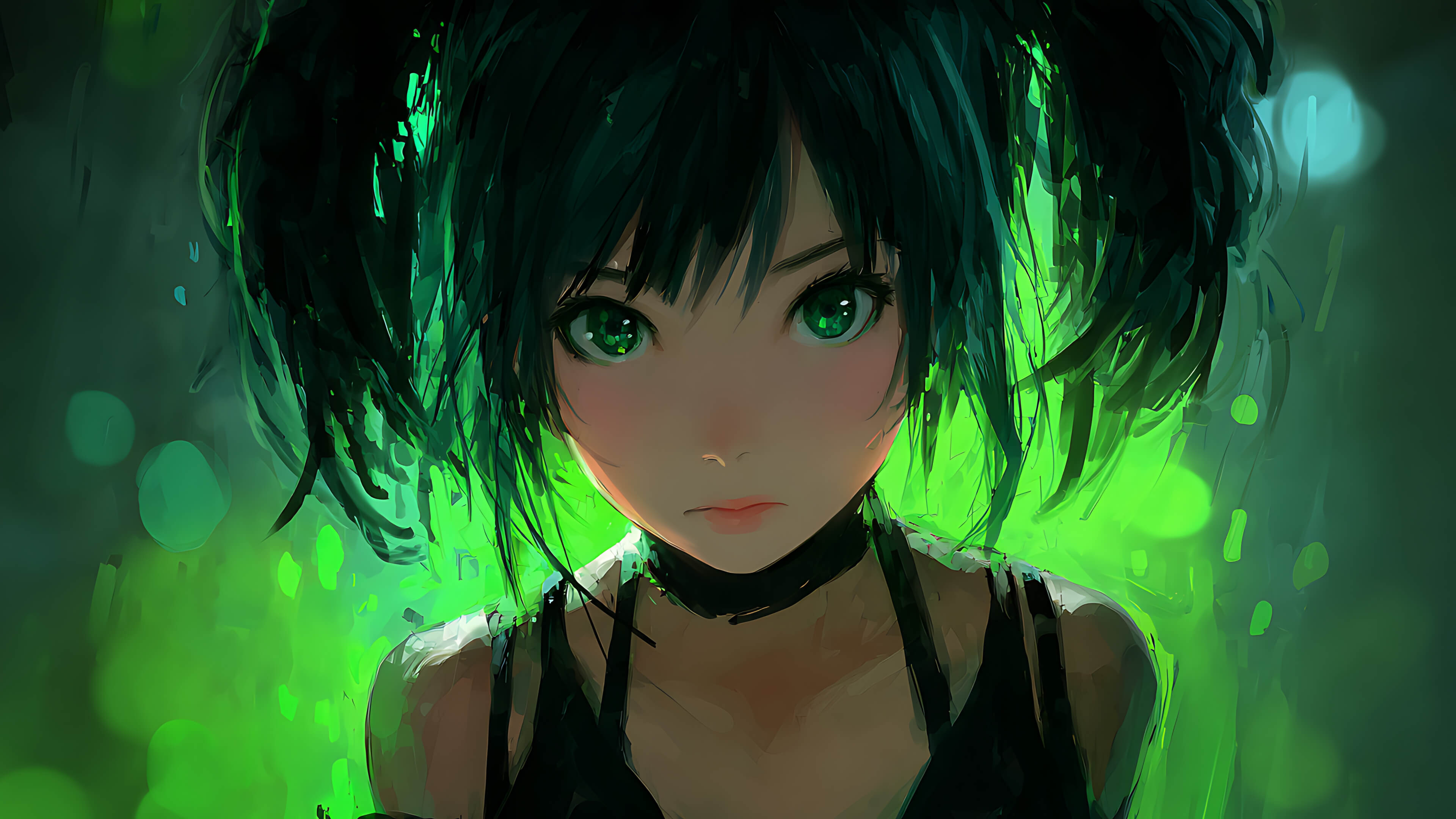 Anime girl with glowing green eyes and black pigtails, surrounded by a green magical aura with soft light effects.