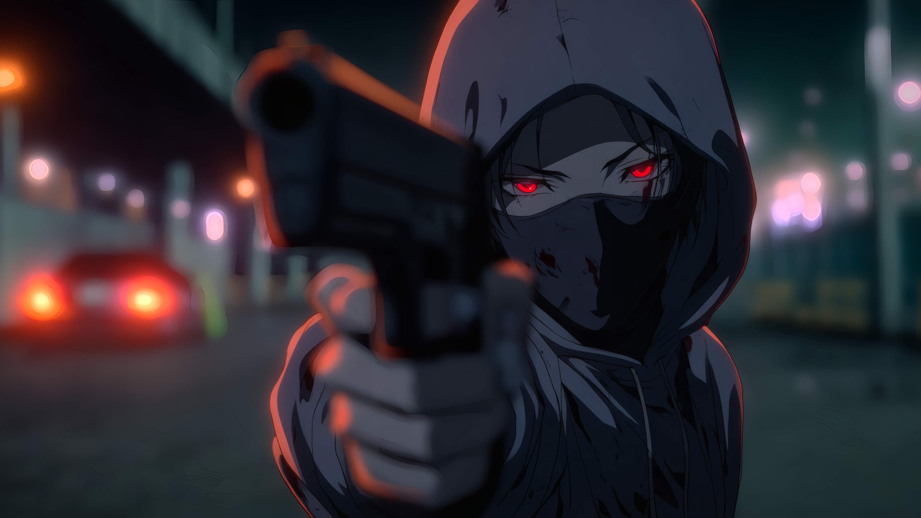anime, masked, hooded, gun, red eyes, dark street, urban, action, intense, gritty, vigilante, crime, thriller, assassin, revenge, street lights, getaway, anime shooter, dramatic