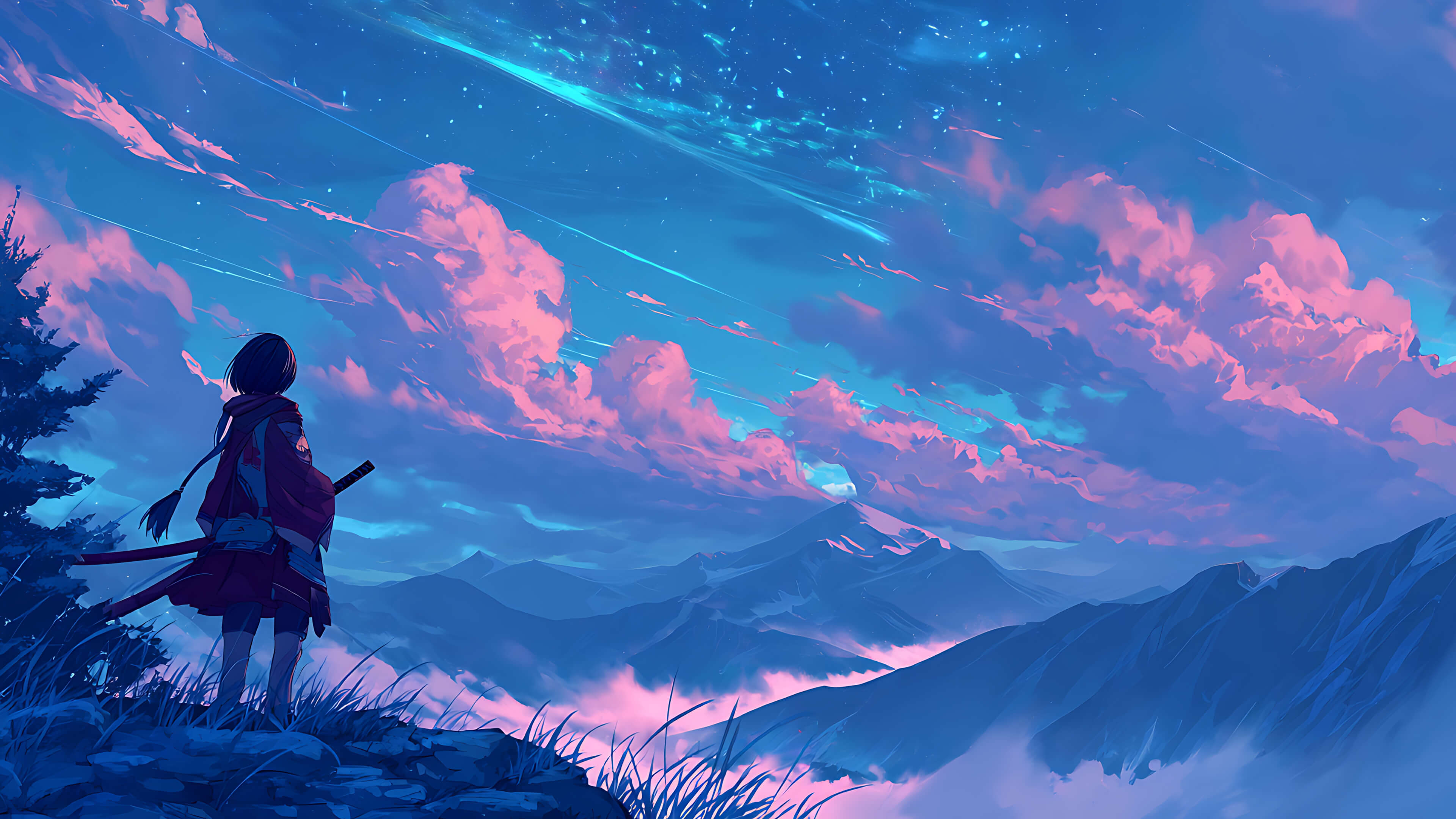 Anime character with a sword standing on a cliffside, looking at colorful mountains and a starry sky with pink clouds.