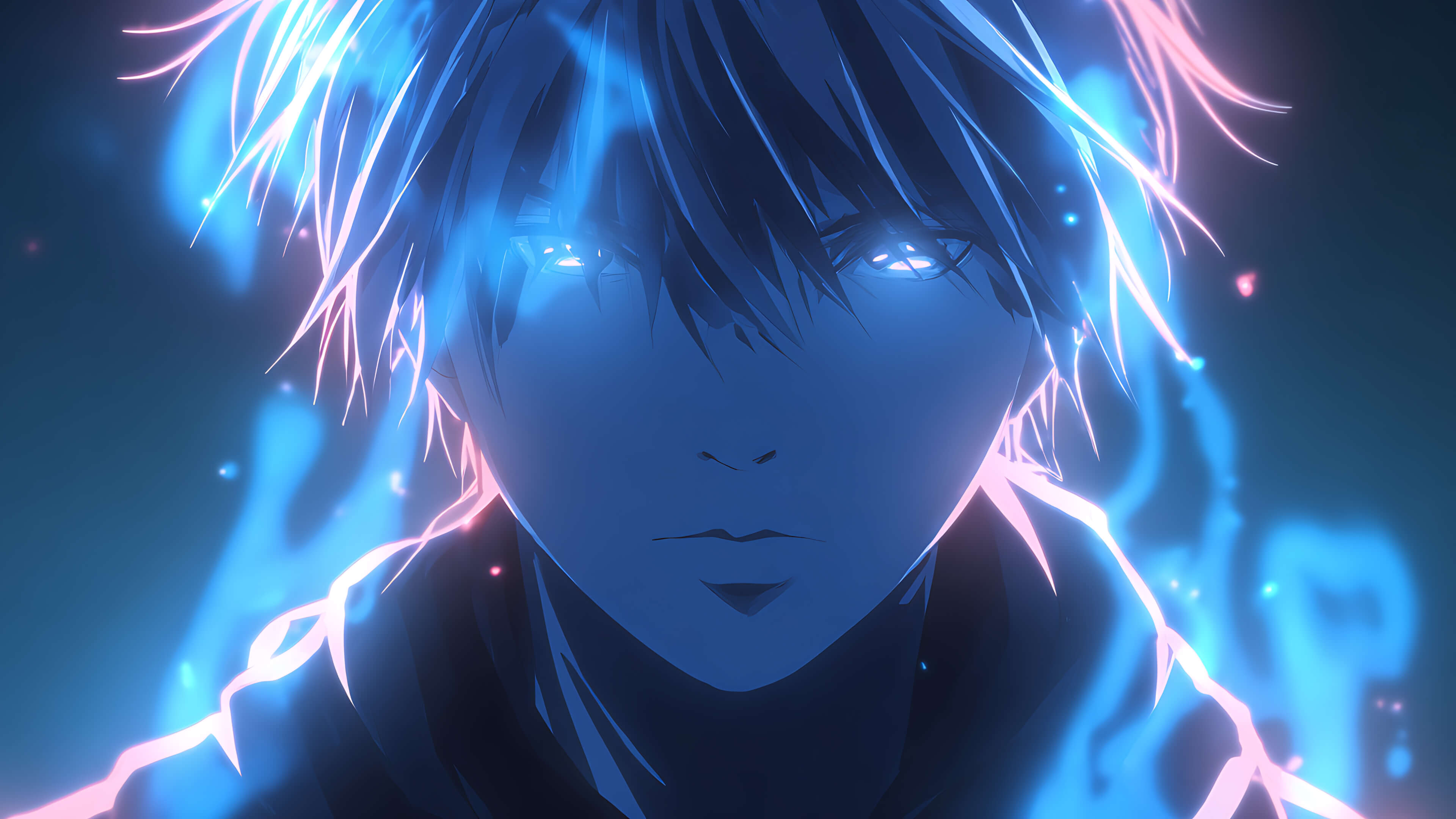 A powerful anime portrait of a young man engulfed in an electrifying blue and pink aura. His glowing eyes pierce through the darkness with unwavering focus, exuding raw energy and calm intensity. The vibrant strands of power arc around him like lightning, suggesting he's either awakening his true potential or preparing for a supernatural battle.