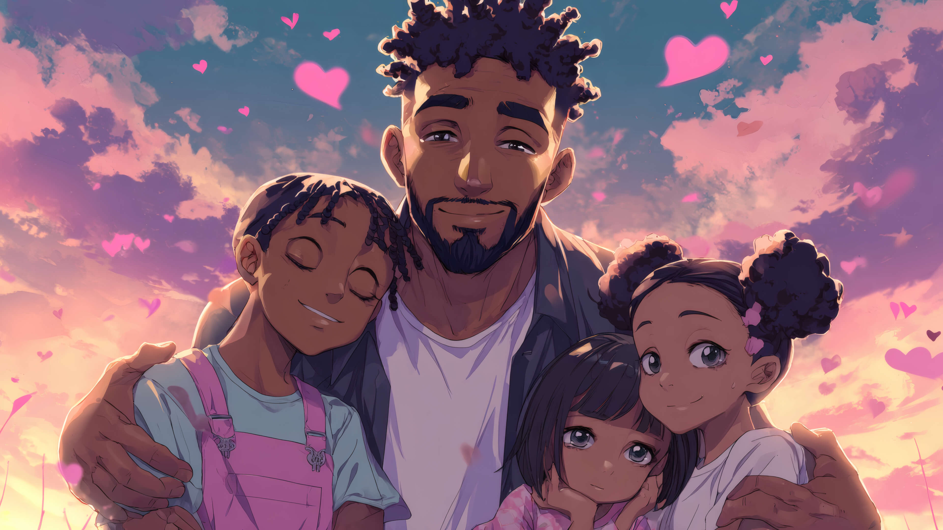 Anime-style illustration of a Black father smiling warmly while hugging his three children in front of a dreamy sunset sky with pink hearts floating around.