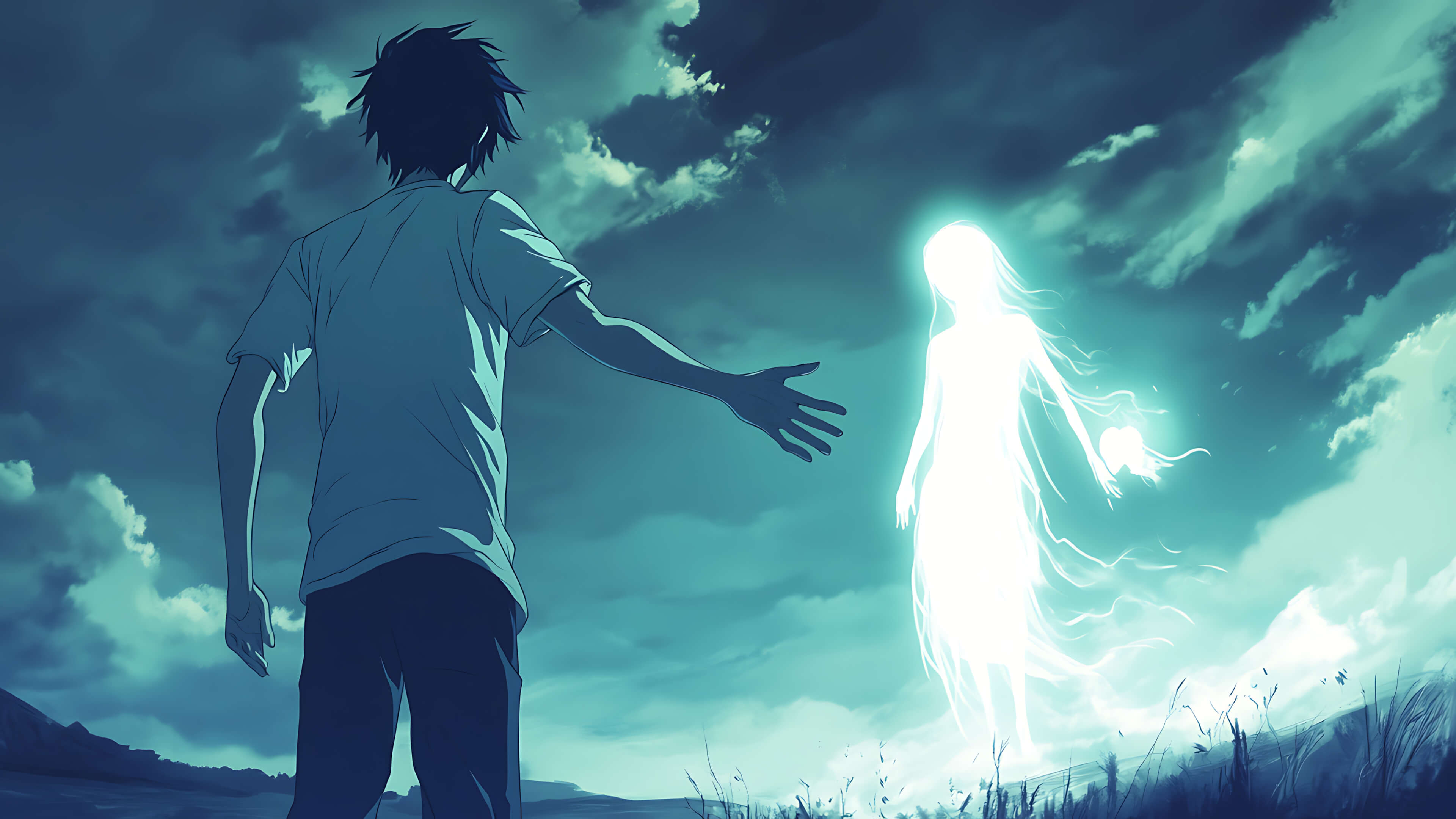 Anime-style artwork of a glowing ghostly woman holding a heart as a boy reaches toward her in a field under a cloudy, blue-tinted sky.