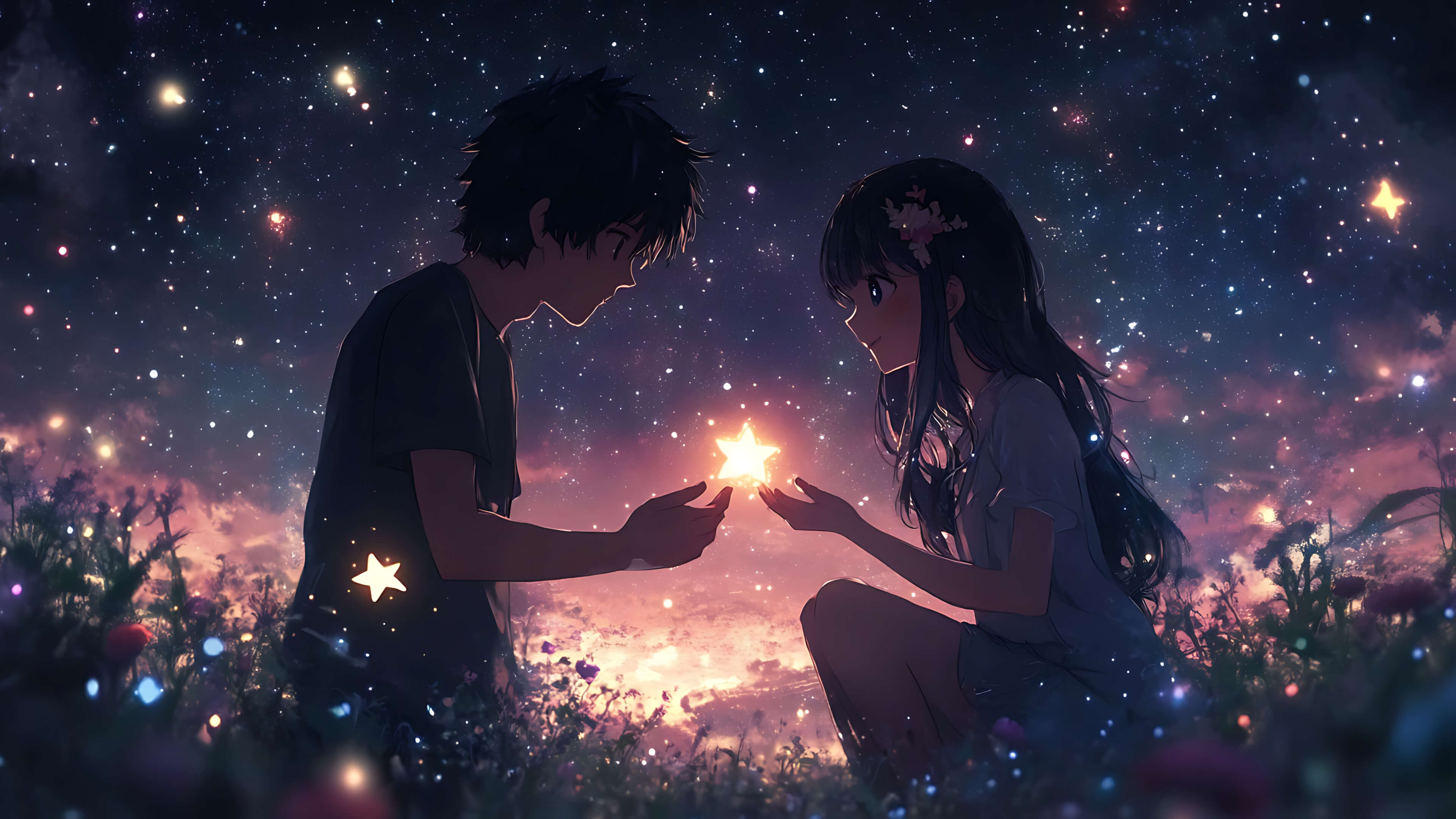 A dreamy anime-style scene of a boy gently offering a glowing star to a girl under a breathtaking, star-filled sky. Surrounded by wildflowers and celestial light, the air feels magical - but there’s a quiet sadness in the gesture. It’s a moment of pure love and vulnerability, a symbolic gift of the universe… yet the future of this love remains uncertain.