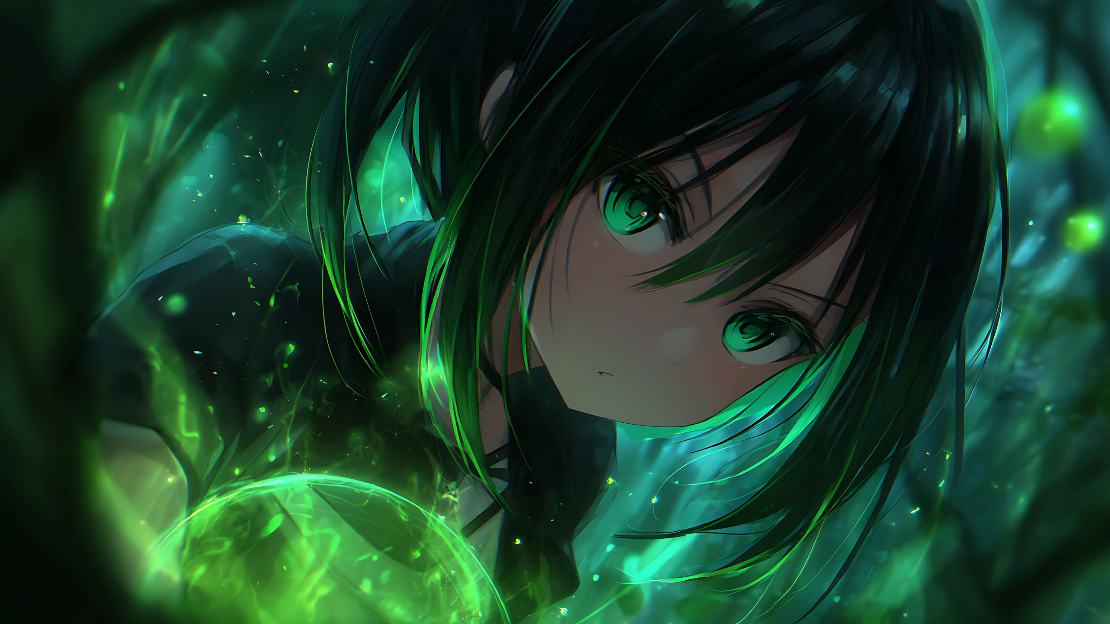 Anime girl with glowing green eyes and black-green hair casting a magical green energy sphere in a glowing forest.