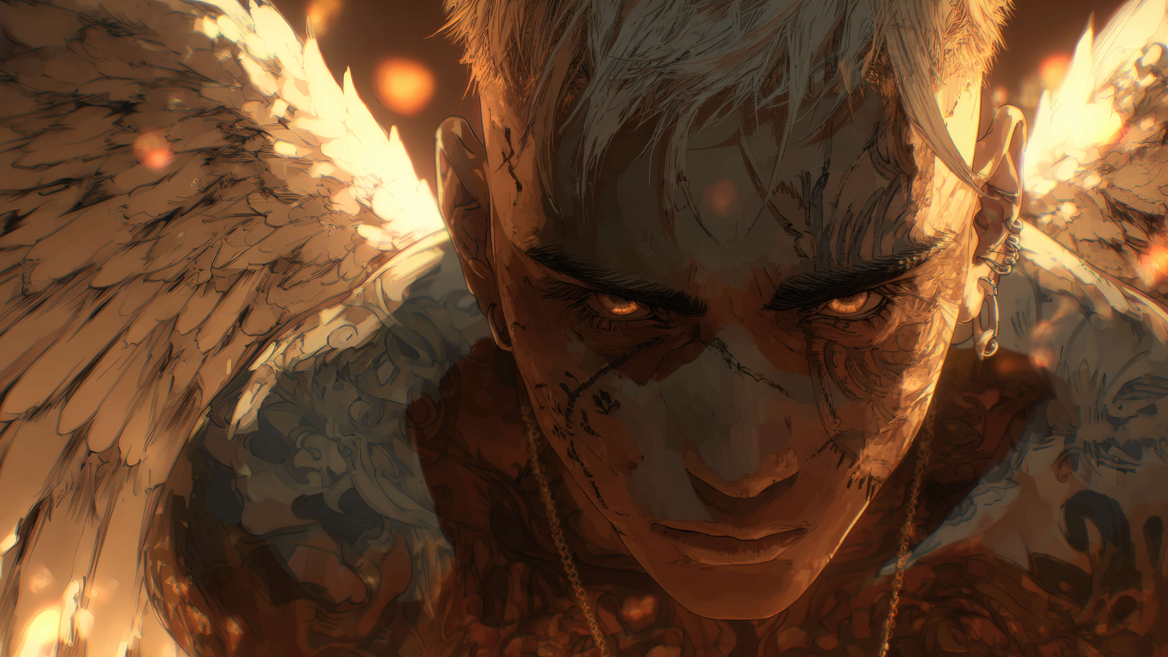 Anime-style image of a tattooed man with glowing amber eyes, angel wings, and facial scars, staring forward with intensity as fiery light surrounds him.
