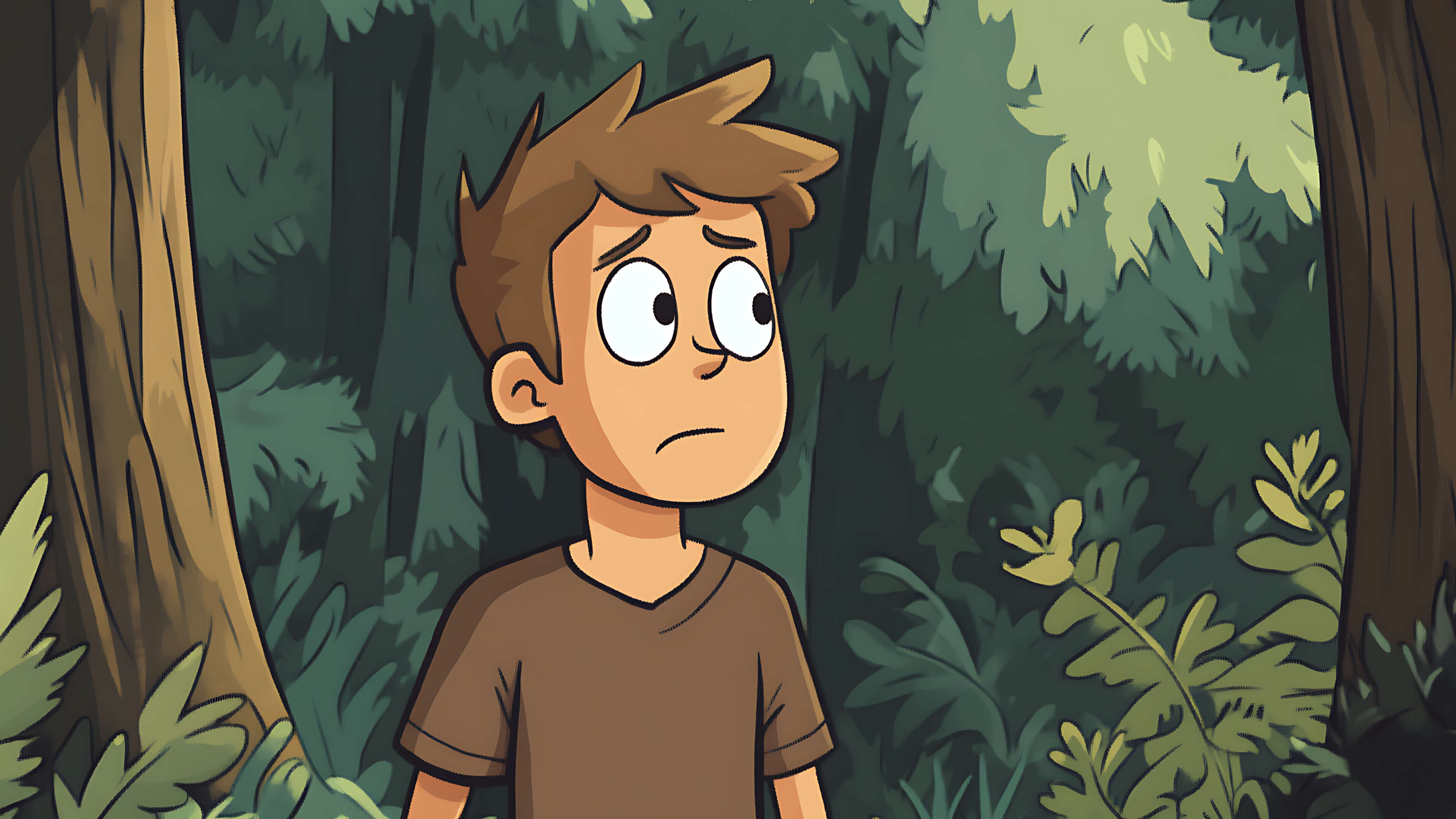 Cartoon boy with a worried expression standing in a dense forest, looking to the side