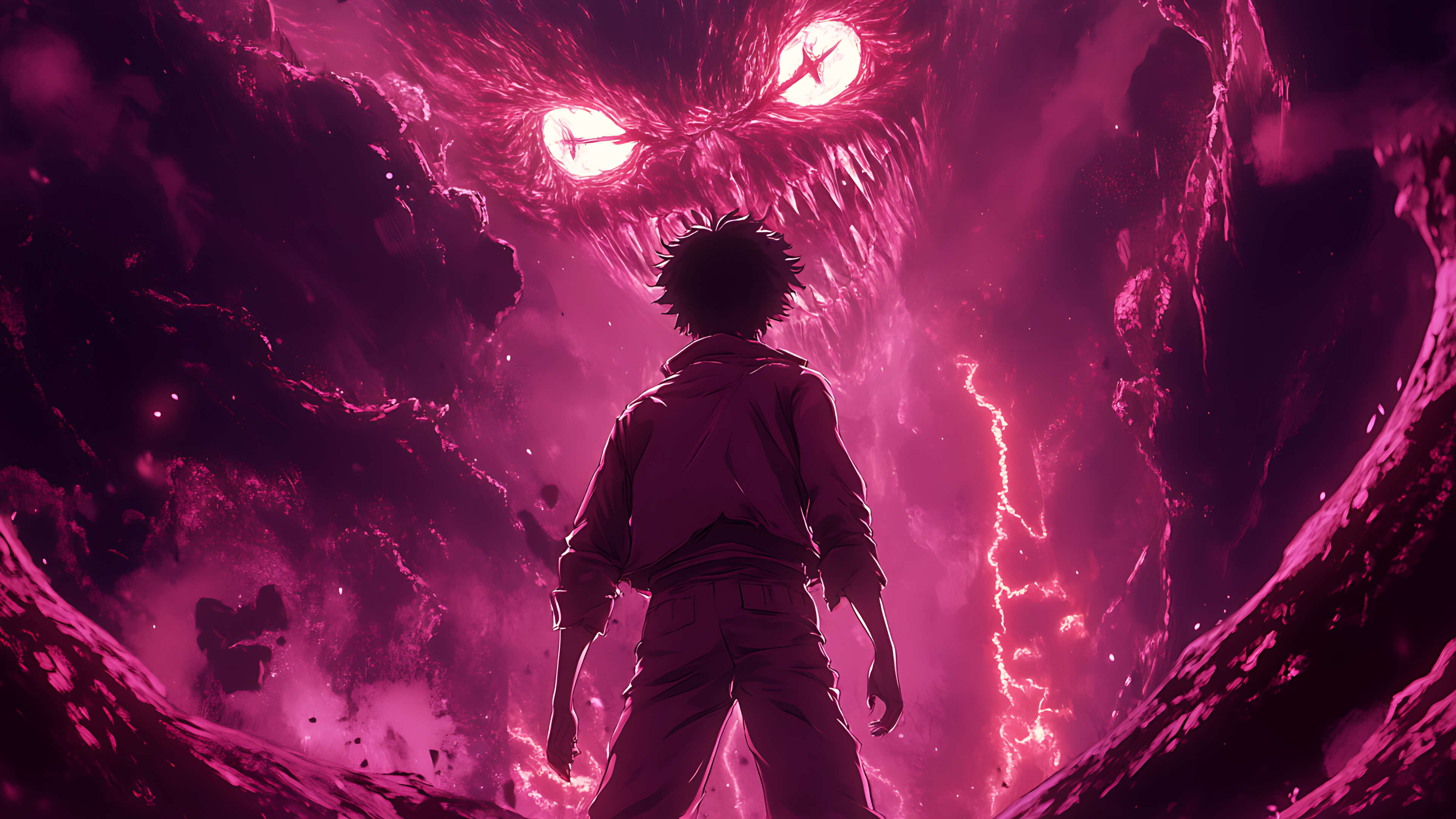 anime battle, final boss, anime hero, epic showdown, dark fantasy, void realm, crimson monster, dramatic scene, facing fear, hero vs demon, last stand, anime confrontation, storm of fate