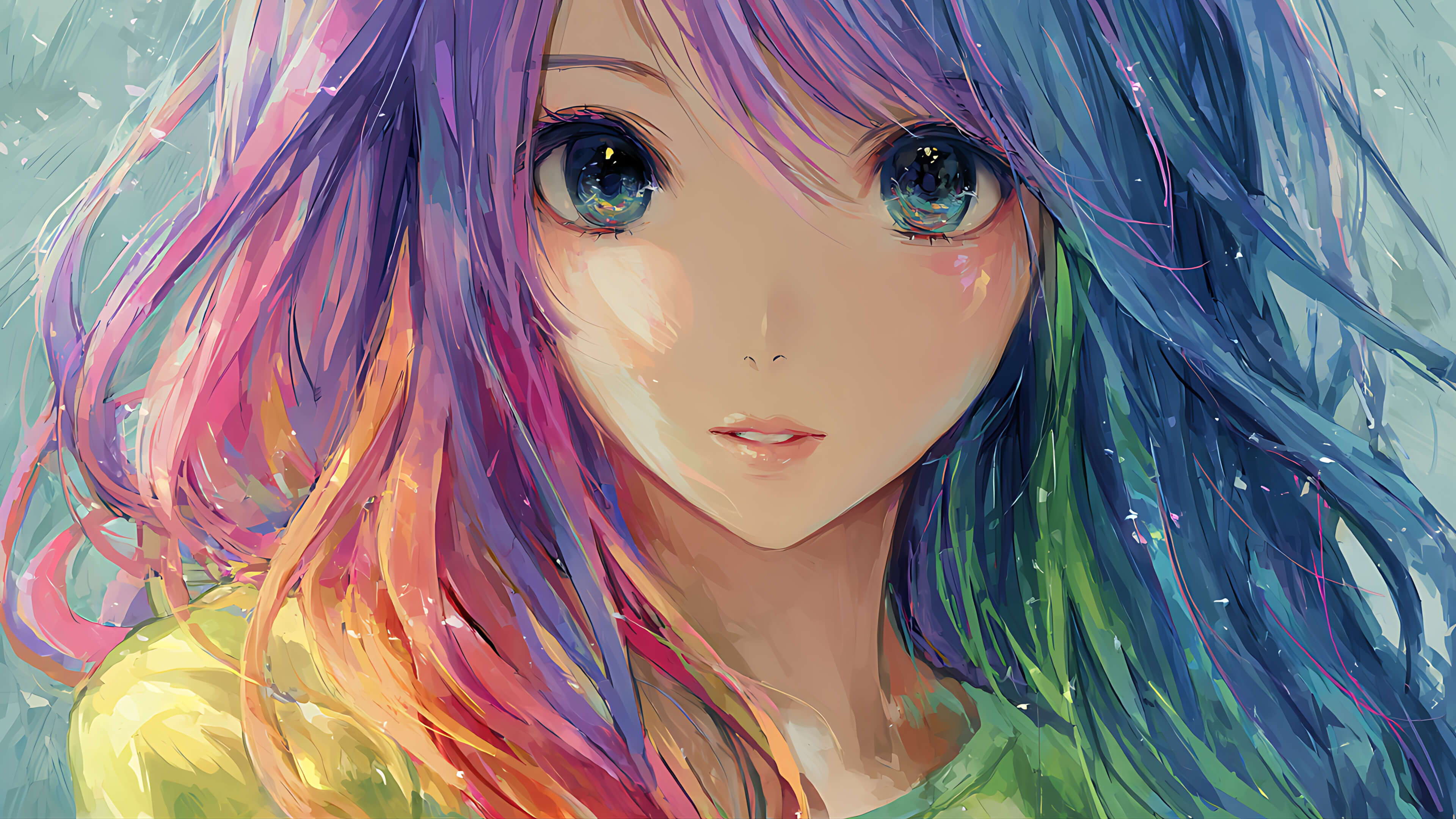 anime girl, rainbow hair, colorful, anime portrait, anime photo