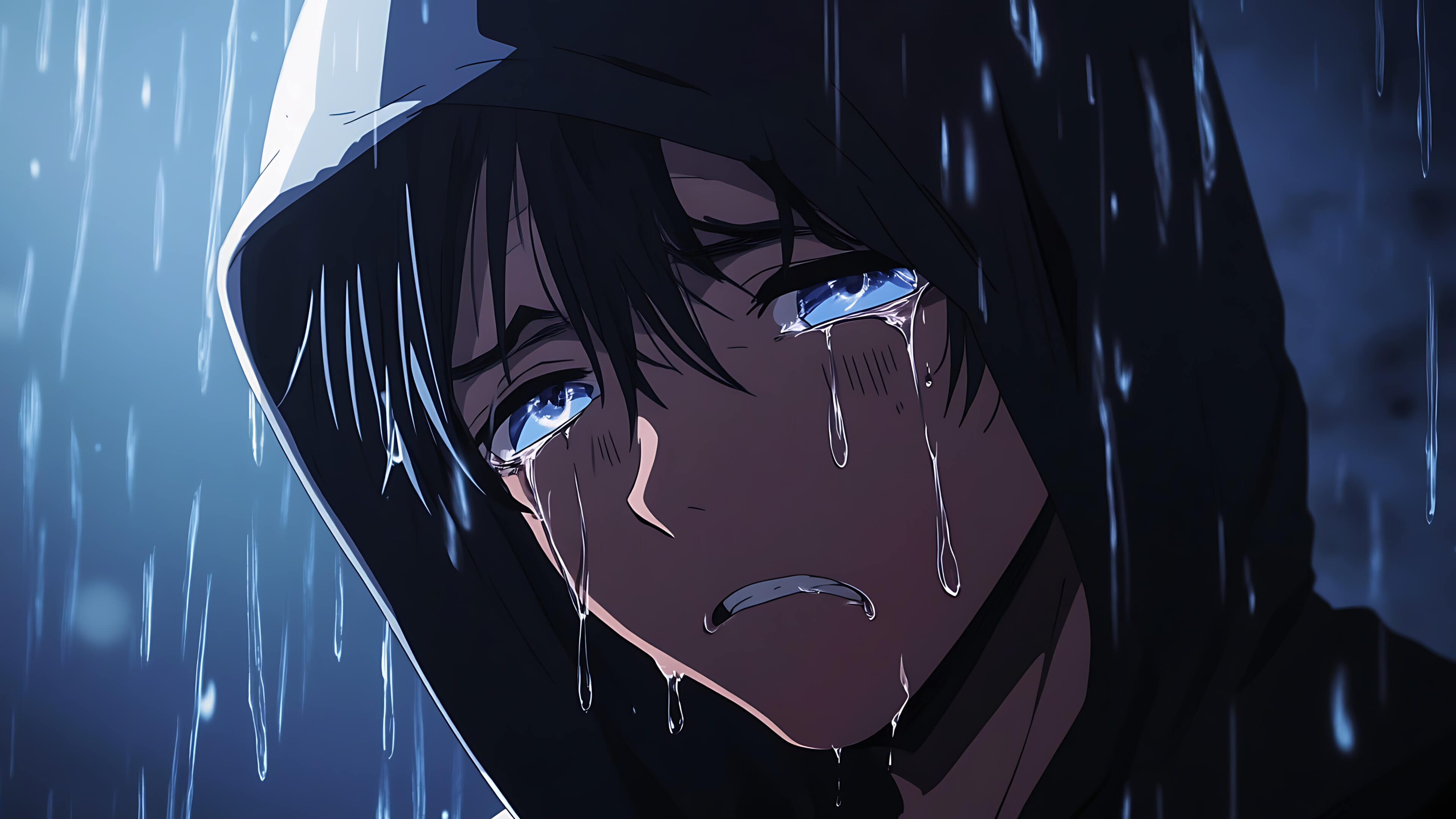 Anime-style illustration of a crying boy in a hoodie standing in the rain with tear-filled blue eyes and a sorrowful expression.