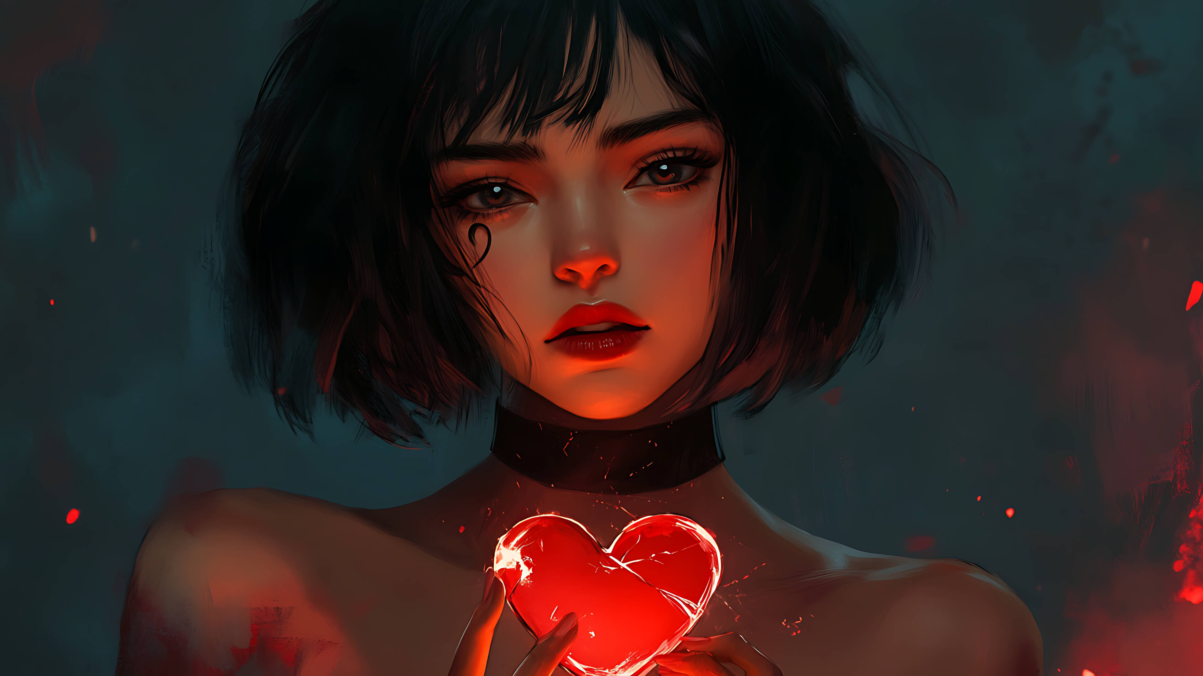 Digital painting of a sad girl with short black hair holding a glowing, cracked red heart in her hands, with a dark and moody background.