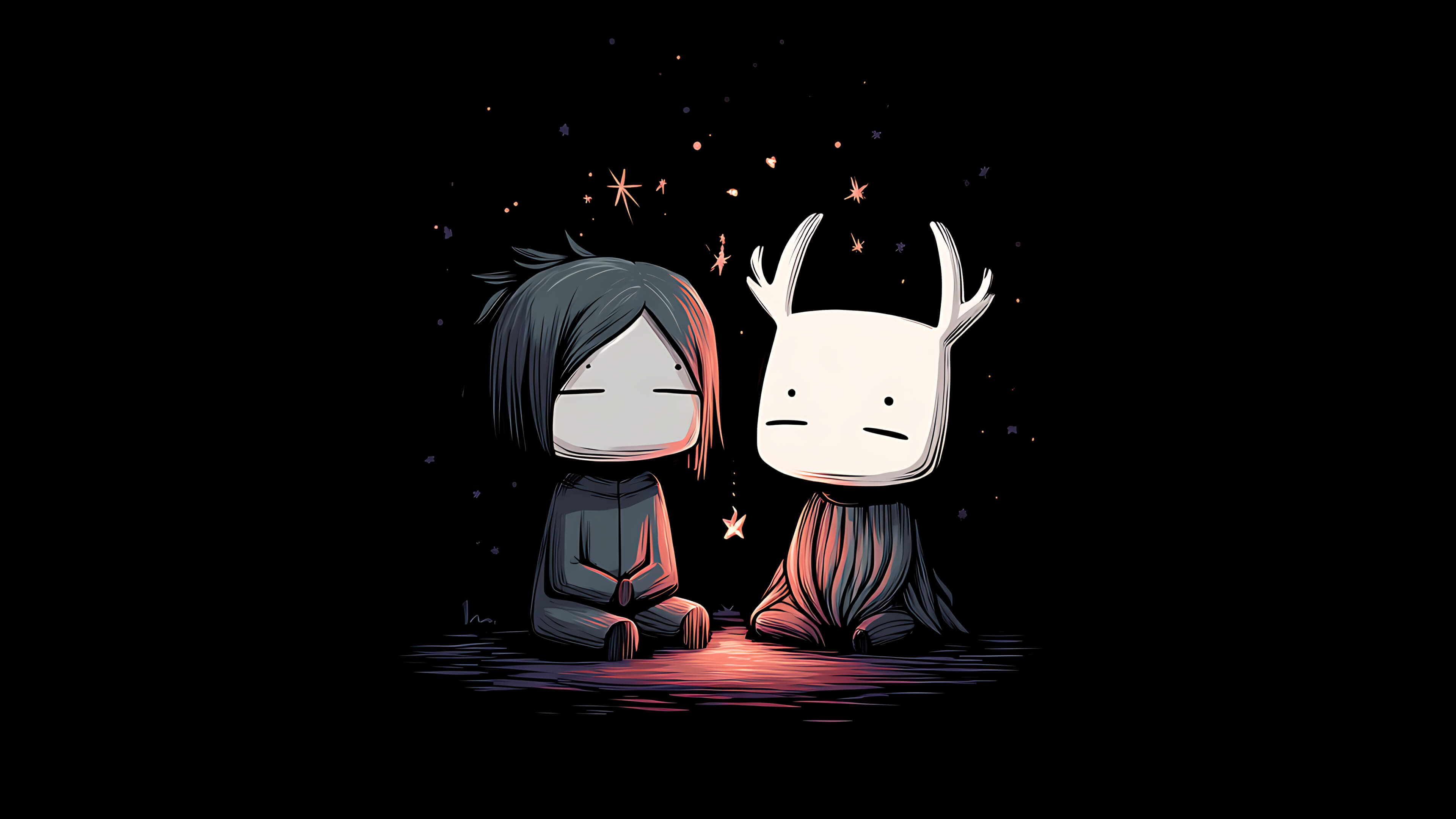 A minimalist and emotional illustration of two simple chibi characters sitting quietly together beneath a sky sprinkled with tiny glowing stars. One has dark hair and a neutral expression, while the other resembles a white deer-like figure with antlers. They sit by a gentle warm glow on the ground, lost in quiet companionship, surrounded by darkness that enhances the feeling of solitude and cosmic calm.