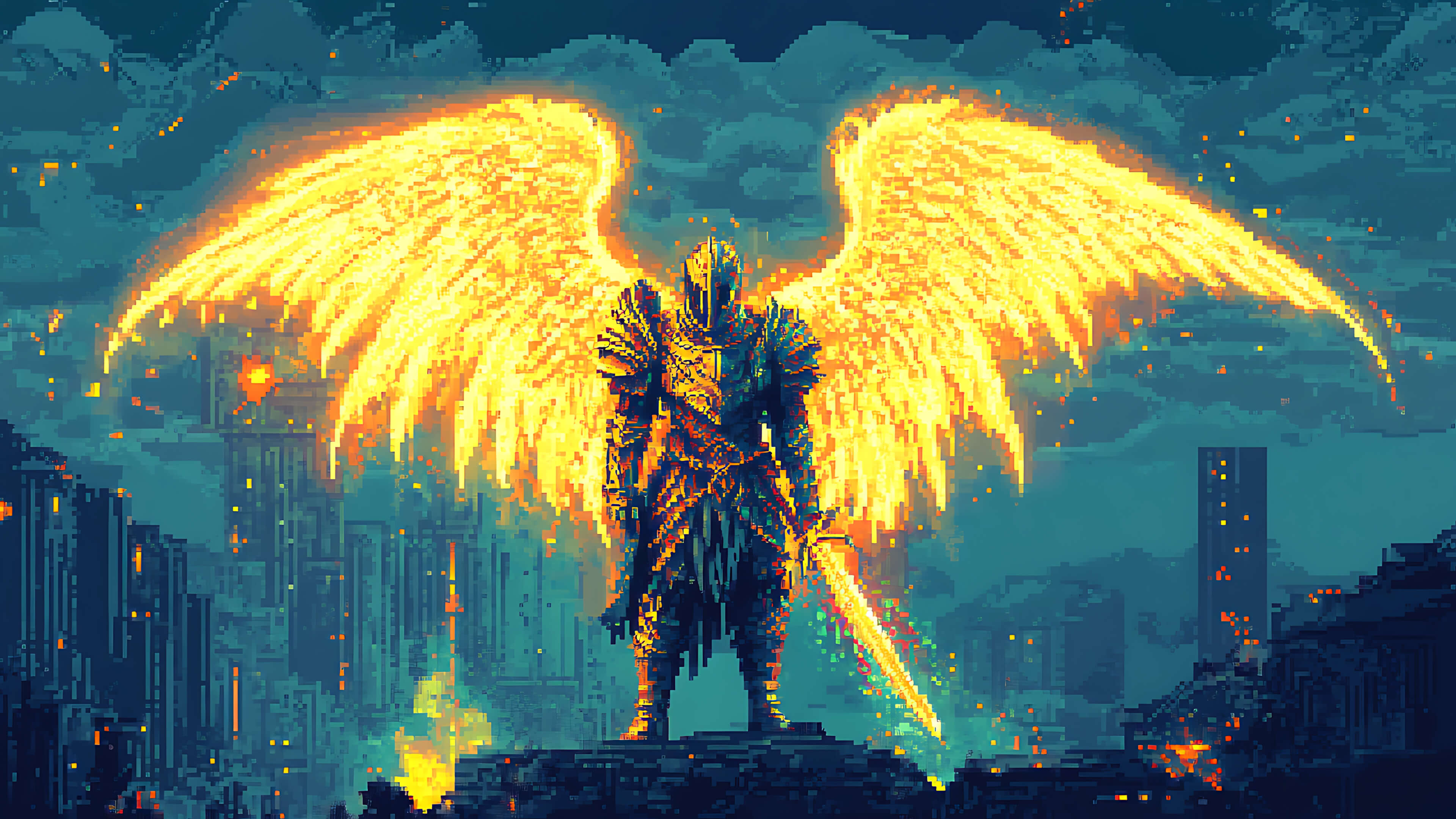 Pixel art of a glowing golden knight with fiery angel wings holding a radiant sword, standing over a city in ruins.