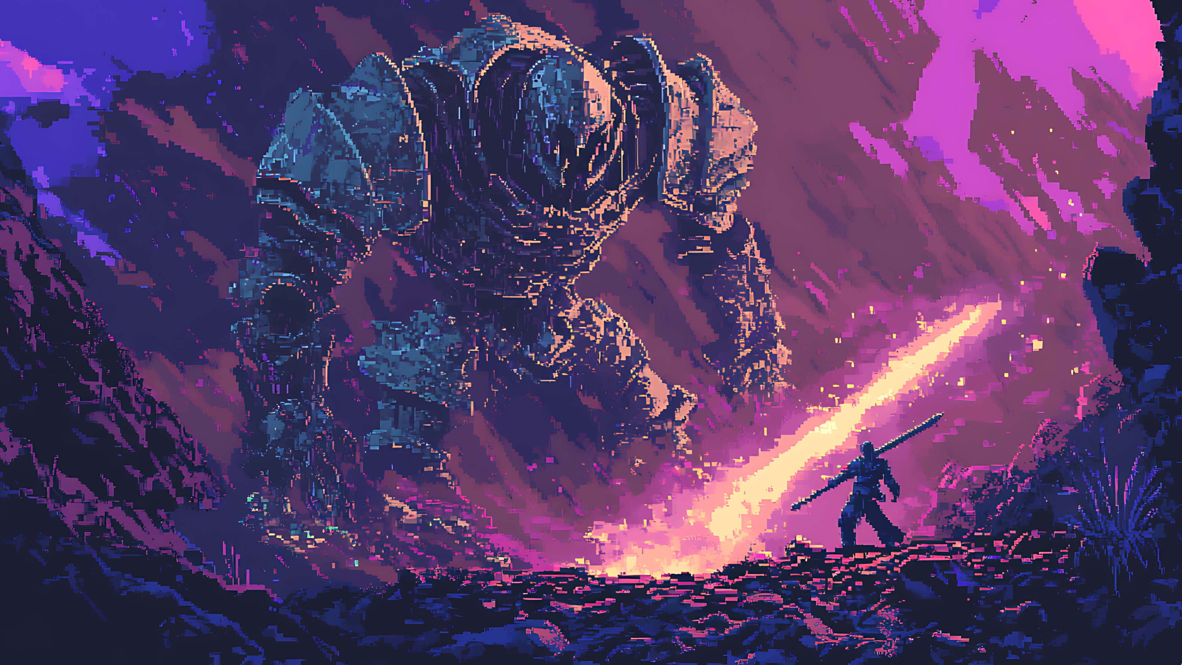 Pixel art of a small warrior with a glowing sword facing a towering armored giant in a fiery canyon under a dramatic purple sky.