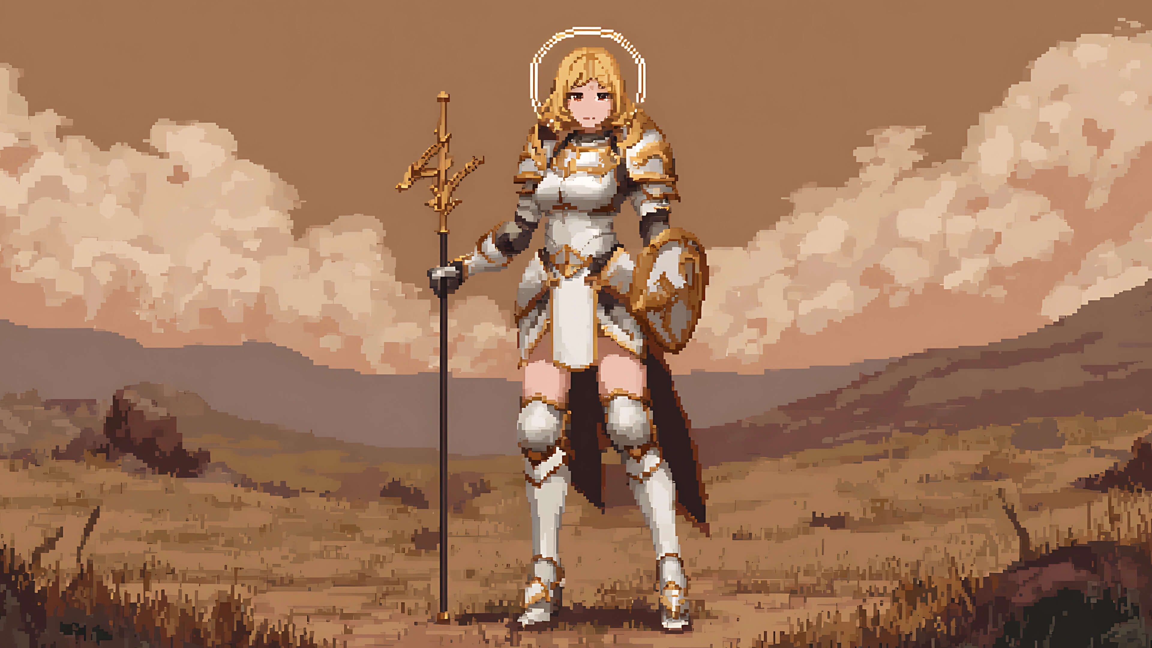 pixel art, paladin, fantasy warrior, holy knight, female character, white armor, medieval fantasy, divine protector, retro game art, RPG character, 2D sprite, digital art, pixel aesthetic, anime style, golden light