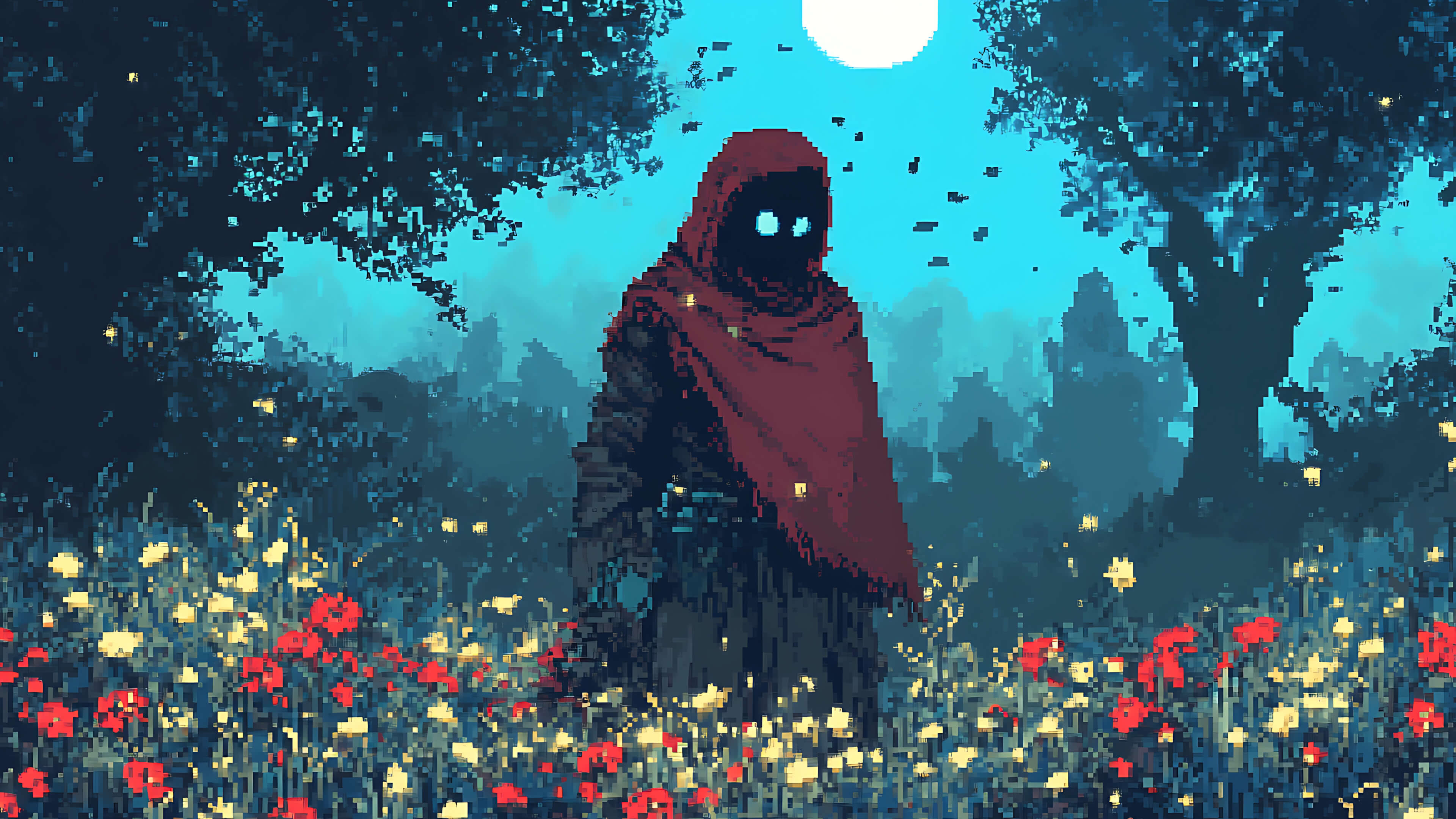 Pixel art of a hooded figure with glowing eyes standing in a field of red and yellow flowers under the moonlight, surrounded by dark trees and fireflies.