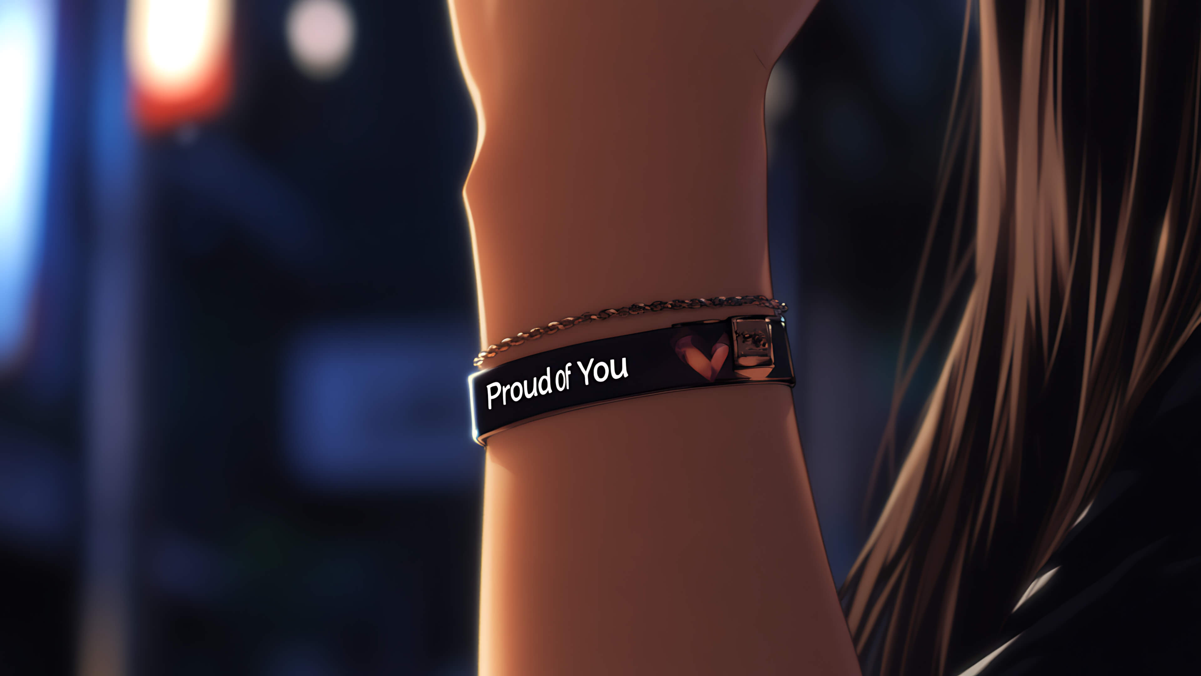 Anime-style close-up of a wrist wearing a bracelet that says “Proud of You” against a softly lit nighttime background.