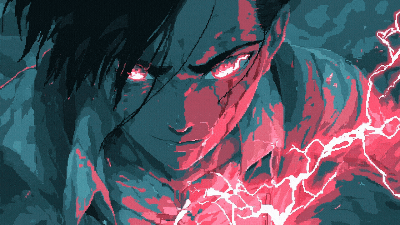 A powerful pixel art close-up of a character’s glowing eyes crackling with red lightning energy. The intense lighting and sharp contrasts capture the moment of transformation - rage, power, and unstoppable determination in a cyber-anime style.