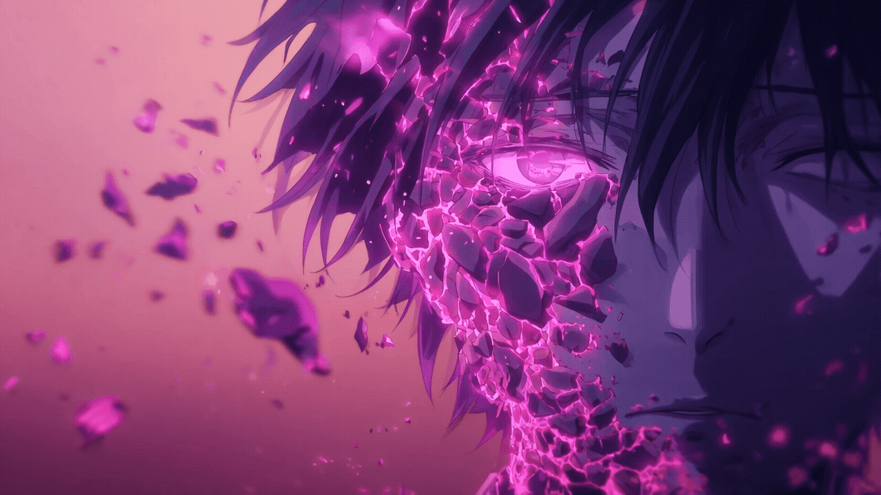 A stunning anime-style artwork showing a close-up of a character’s face breaking apart into glowing violet shards. The bright magenta light and fractured textures symbolize pain, rebirth, and transcendence - a moment caught between destruction and transformation.