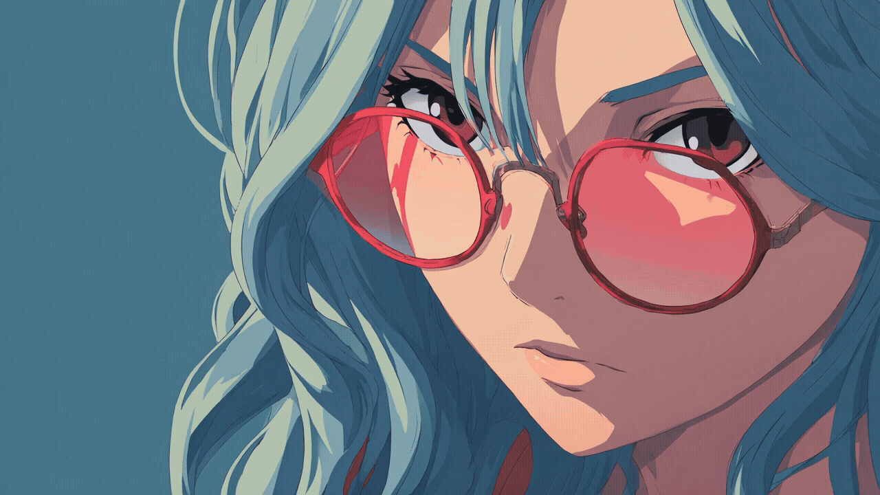 A stylish anime portrait featuring a confident character with long teal hair and striking pink-tinted round glasses. Their intense gaze and subtle expression convey quiet strength and mystery, while warm sunlight reflects off the glasses, adding bold contrast to the cool-tone background. A blend of calm elegance and modern attitude, captured with cinematic anime shading and sharp detail.