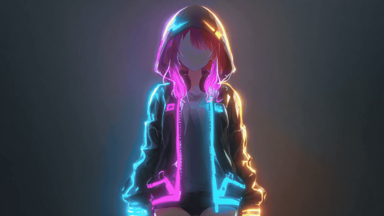 A striking cyberpunk anime figure stands beneath soft studio light, wearing a hooded jacket split with vibrant cyan and fiery gold neon energy. Her two-toned hair glows in electric contrast-pink on one side, warm gold on the other-symbolizing duality, balance, and digital rebellion. This futuristic artwork blends anonymity, power, and cyber-street fashion, perfect for wallpapers, album covers, gaming visuals, and sci-fi branding.