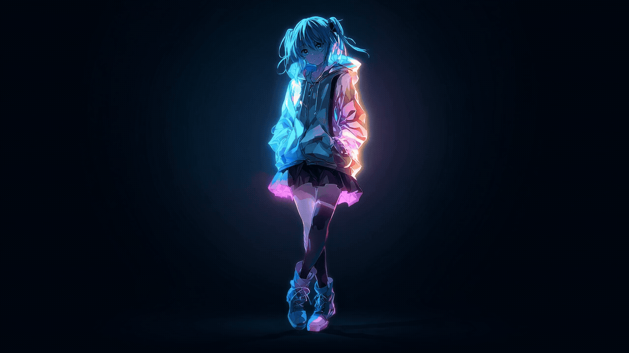 A glowing cyberpunk anime girl walks confidently through darkness, illuminated by radiant cyan and pink neon light reflecting off her oversized hoodie, skirt, and sneakers. Her relaxed posture and soft expression blend street style with futuristic energy, creating a powerful contrast between innocence and digital rebellion. Perfect for wallpapers, fashion visuals, album art, and cyber-themed branding.