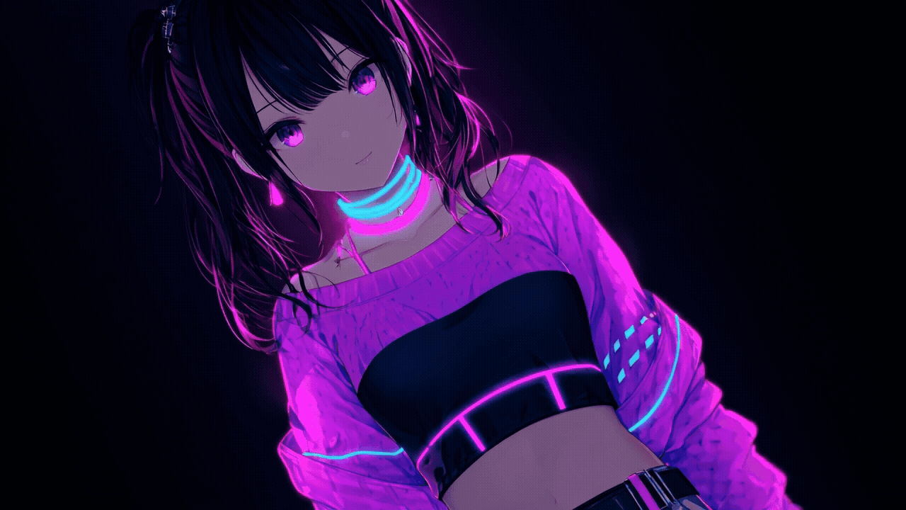 A futuristic anime-style portrait of a glowing-eyed cyberpunk girl bathed in vibrant purple and pink neon light. Her translucent jacket, illuminated choker, and sleek crop top give off a powerful cyber-aesthetic vibe set against a dark, moody background. This artwork blends futuristic fashion, digital energy, and soft emotion-perfect for music covers, wallpapers, tech branding, and modern fantasy visuals.