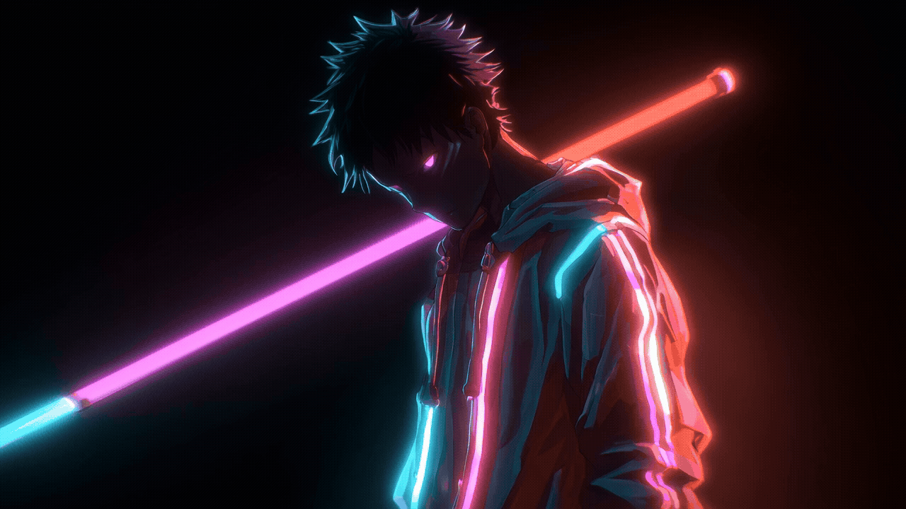 A powerful cyberpunk anime portrait of a lone warrior standing in shadow, illuminated by glowing cyan and magenta neon light. A radiant energy blade rests across his back as his eyes burn with quiet intensity. This futuristic scene blends solitude, strength, and rebellion-perfect for wallpapers, music artwork, gaming visuals, and sci-fi branding.