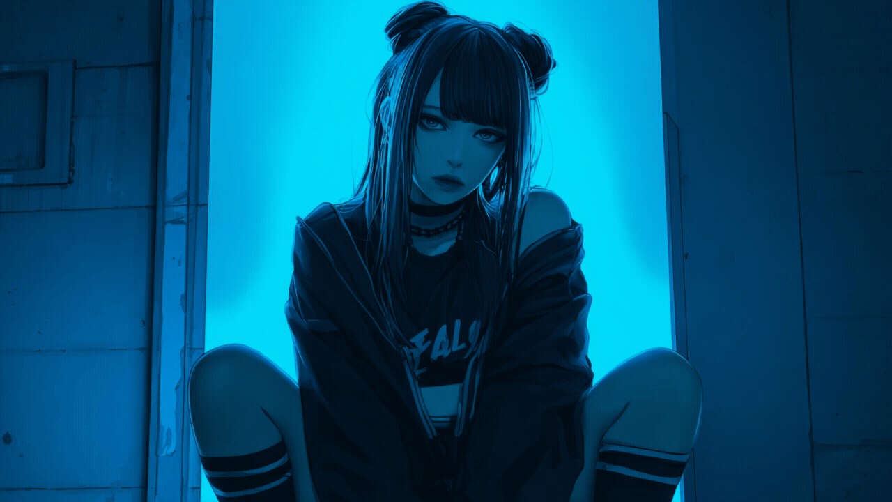 An emotional anime-style scene of a young girl sitting on the floor with her head in her hands, surrounded by cold blue light pouring through a doorway. Her tense posture, shadowed face, and enclosed space evoke feelings of anxiety, isolation, and inner conflict. This powerful artwork captures a raw human moment, making it ideal for mental health visuals, emotional storytelling, music covers, and cinematic digital projects.