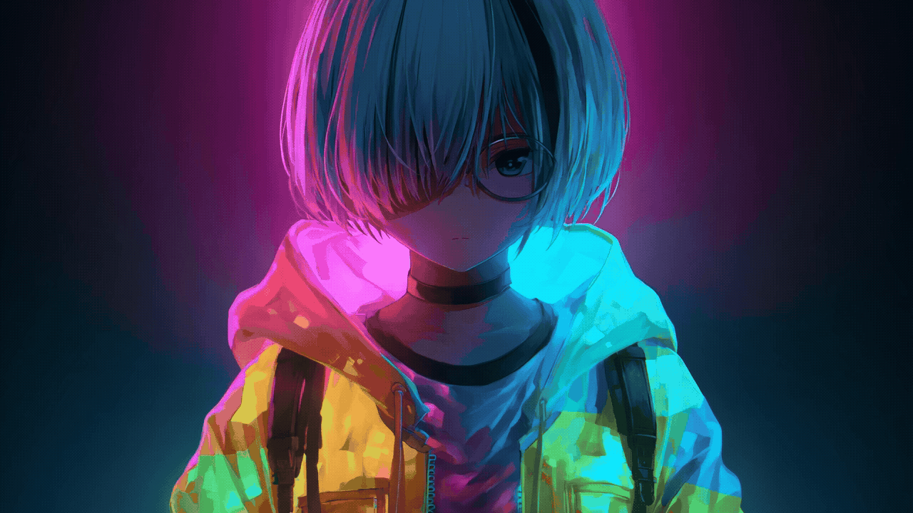 A soft yet powerful cyberpunk anime portrait of a hooded character standing in glowing cyan, magenta, and gold light. Their eyes are gently closed beneath short blue hair, as vibrant reflections ripple across a transparent jacket and choker. This artwork captures a moment of inner stillness within a world of digital noise-perfect for wallpapers, album art, emotional storytelling, and futuristic branding.