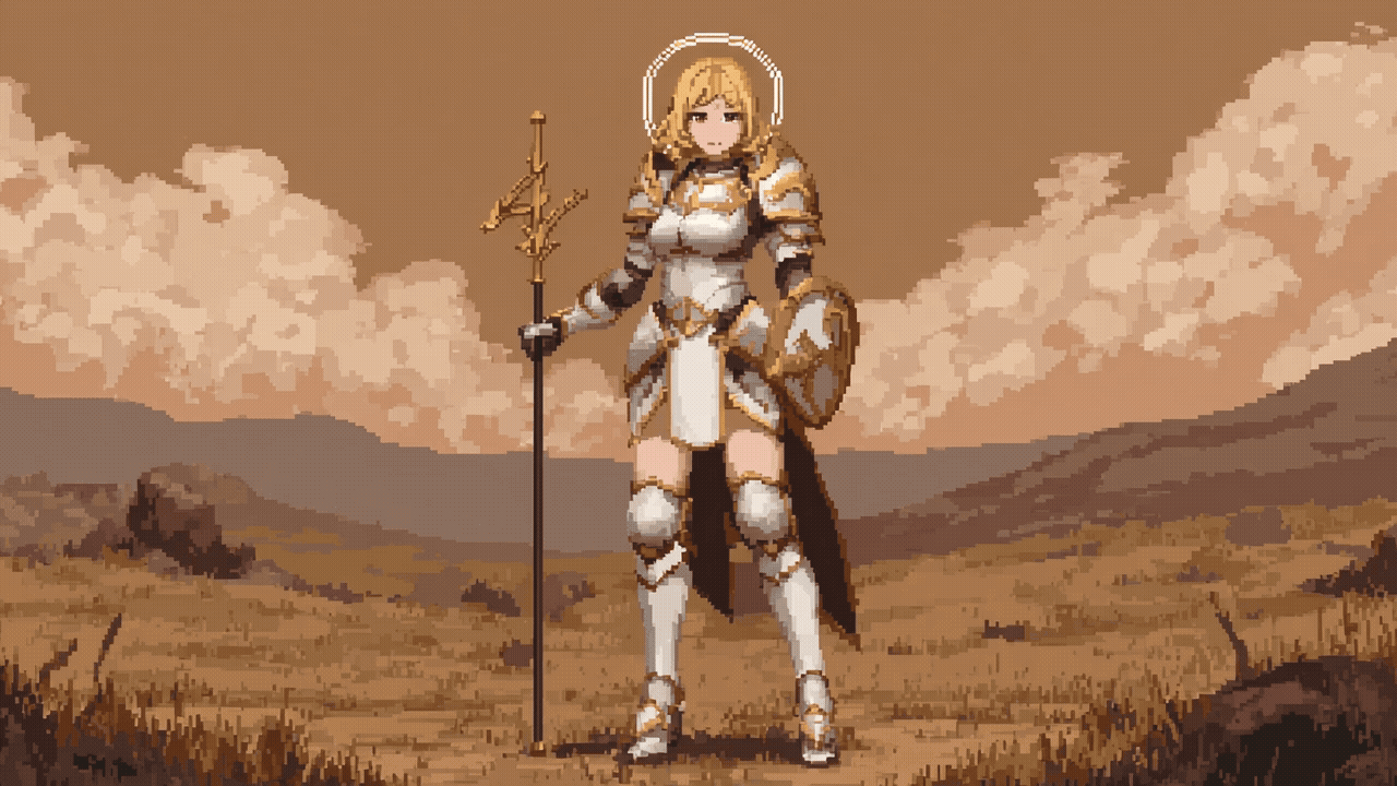 A radiant pixel art illustration of a blonde female paladin standing in a sunlit field. Wearing white and gold armor, she holds a sacred staff and shield while a glowing halo shines above her head. The warm tones and detailed textures evoke faith, protection, and divine justice in a fantasy setting.