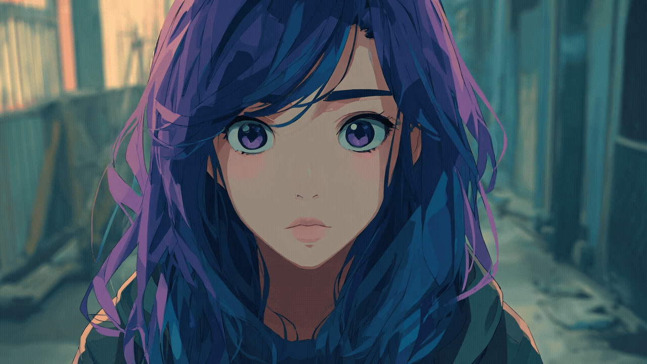 A soft and expressive anime portrait of a girl with flowing blue-violet hair, gazing off into the distance with quiet curiosity. Surrounded by muted city alley tones, she stands out as a gentle spark of color and emotion in an urban world. Her thoughtful expression captures a moment of wonder, reflection, and quiet beauty.