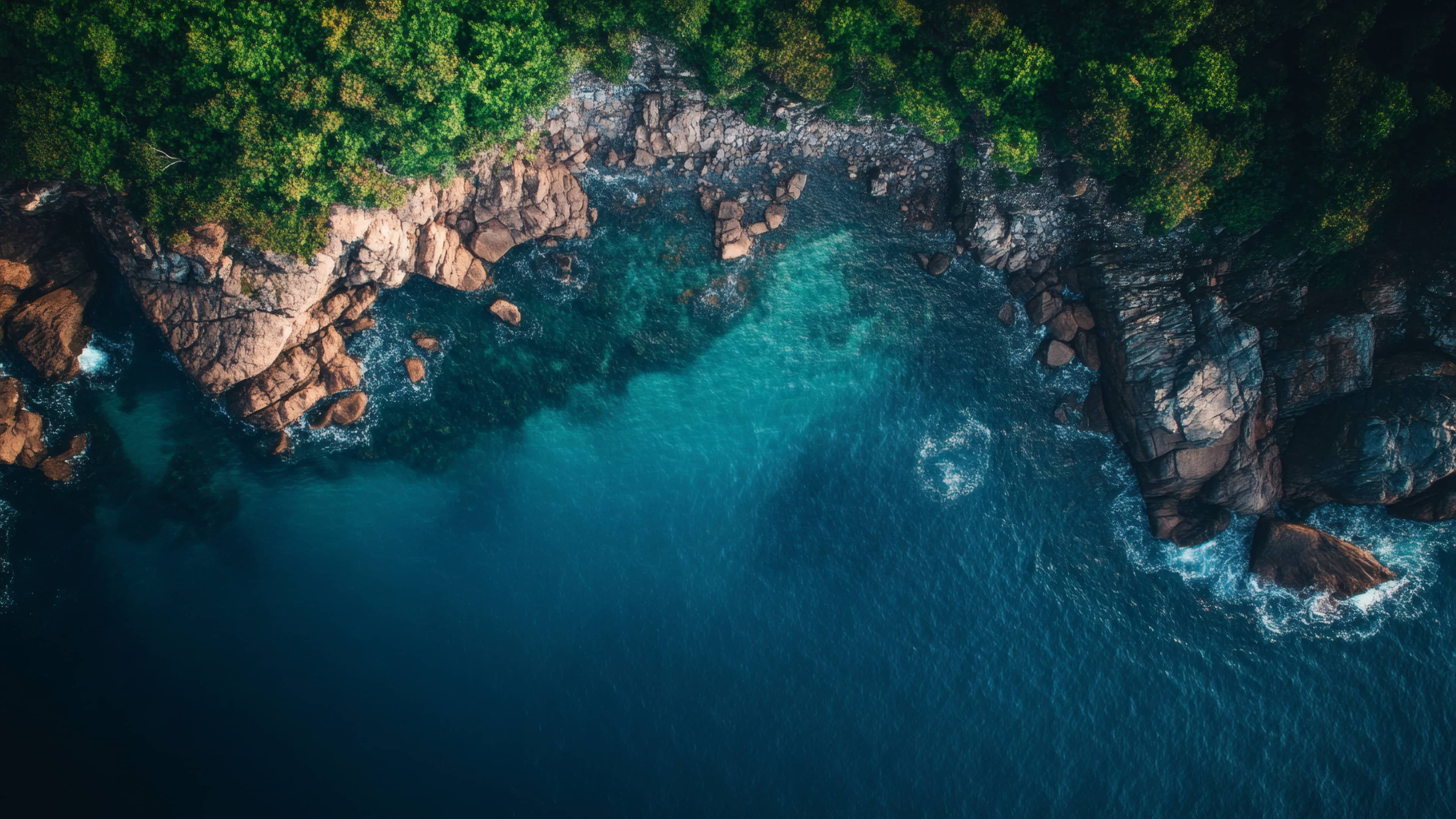 A stunning aerial perspective of a rocky coastline surrounded by lush greenery, with clear turquoise waters gently crashing against the rugged cliffs.