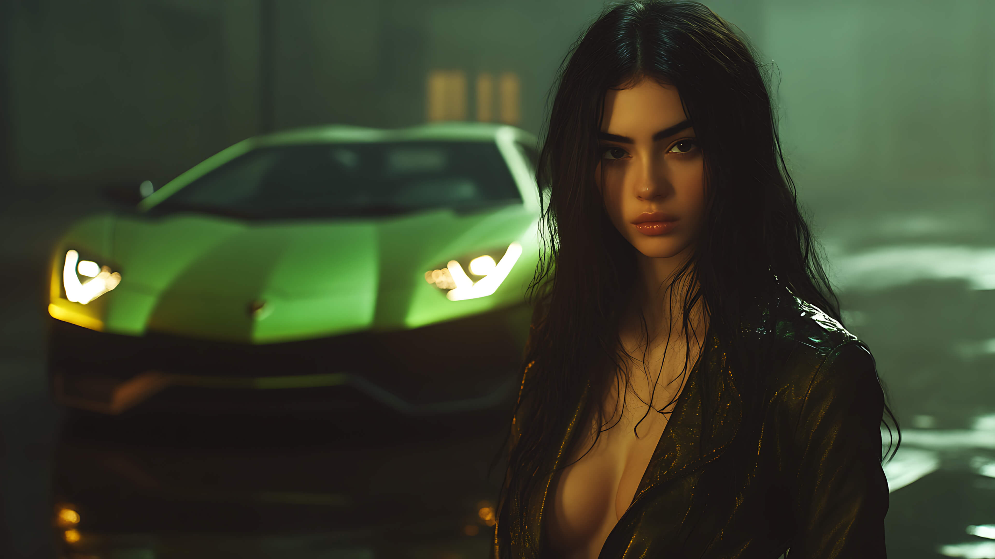 A dark-haired woman with wet, tousled hair stands confidently in front of a glowing green Lamborghini in a rain-slicked setting. Dressed in a shimmering open jacket, her piercing gaze commands attention while the blurred headlights cut through the mist behind her. The cinematic lighting and reflections create a mysterious, late-night atmosphere — blending sensuality, luxury, and danger into one striking visual narrative.