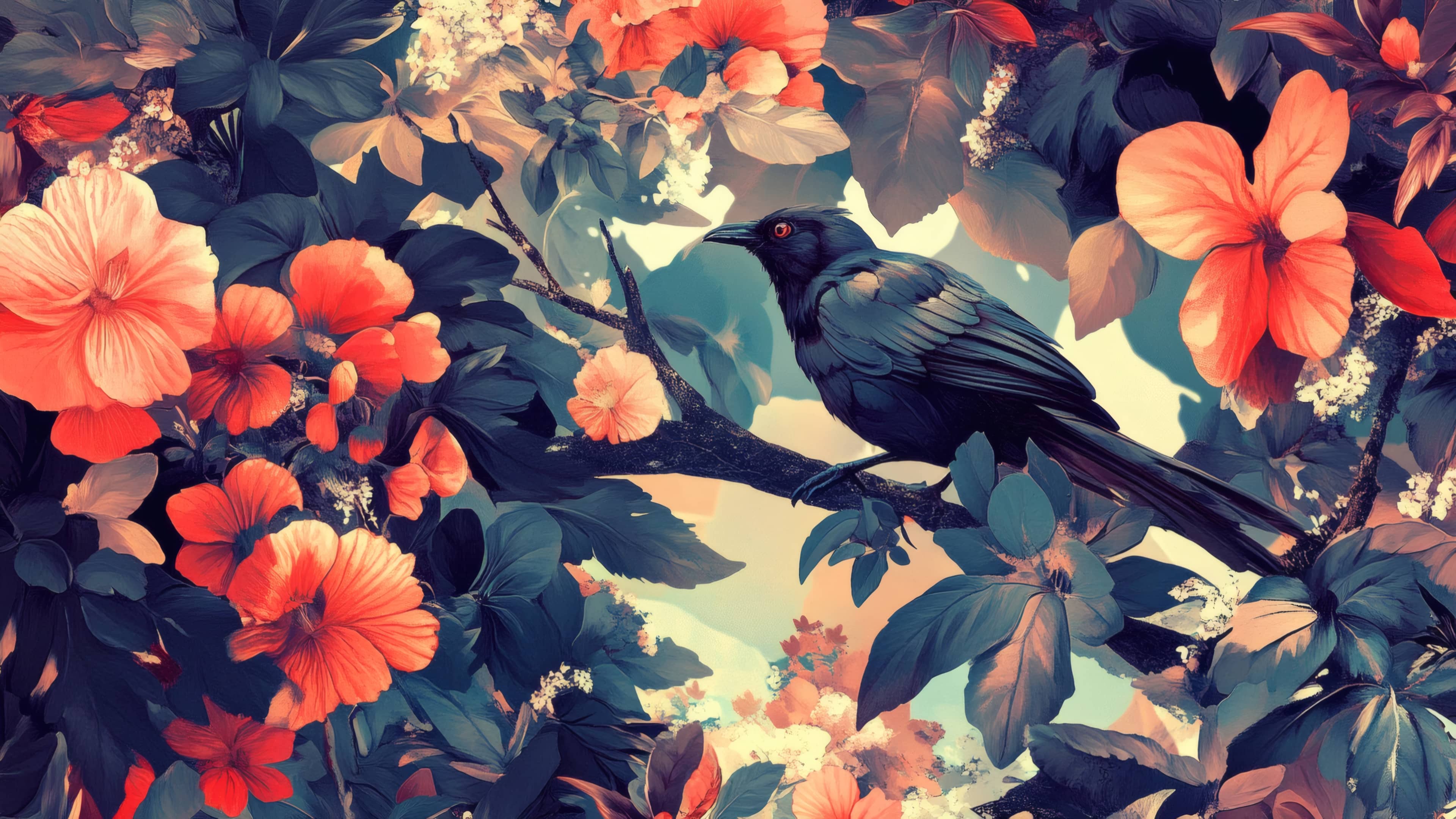 Artistic Bird Perched Amid Vibrant Floral Blossoms