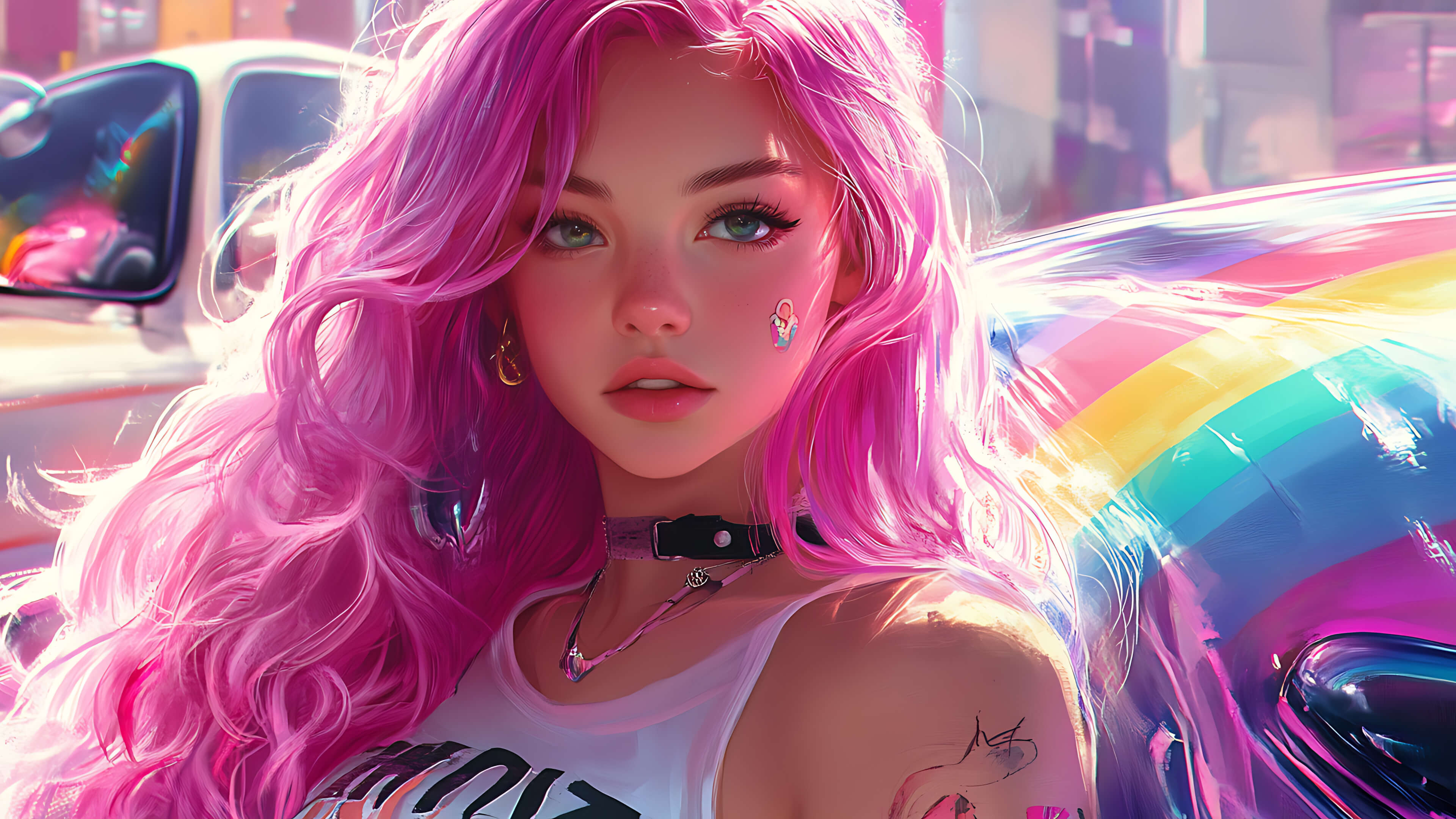 This hyper-vibrant portrait features a striking young woman with vivid pink hair, soft features, and a bold presence. She poses confidently next to a rainbow-painted sports car, merging alt-girl aesthetics with colorful pop culture energy. A heart sticker decorates her cheek, and her accessories — including a collar-style necklace and visible tattoo — add to her edgy, youthful rebellion. The dreamy lighting and candy-colored palette evoke a world of fantasy, fun, and fearless self-expression.