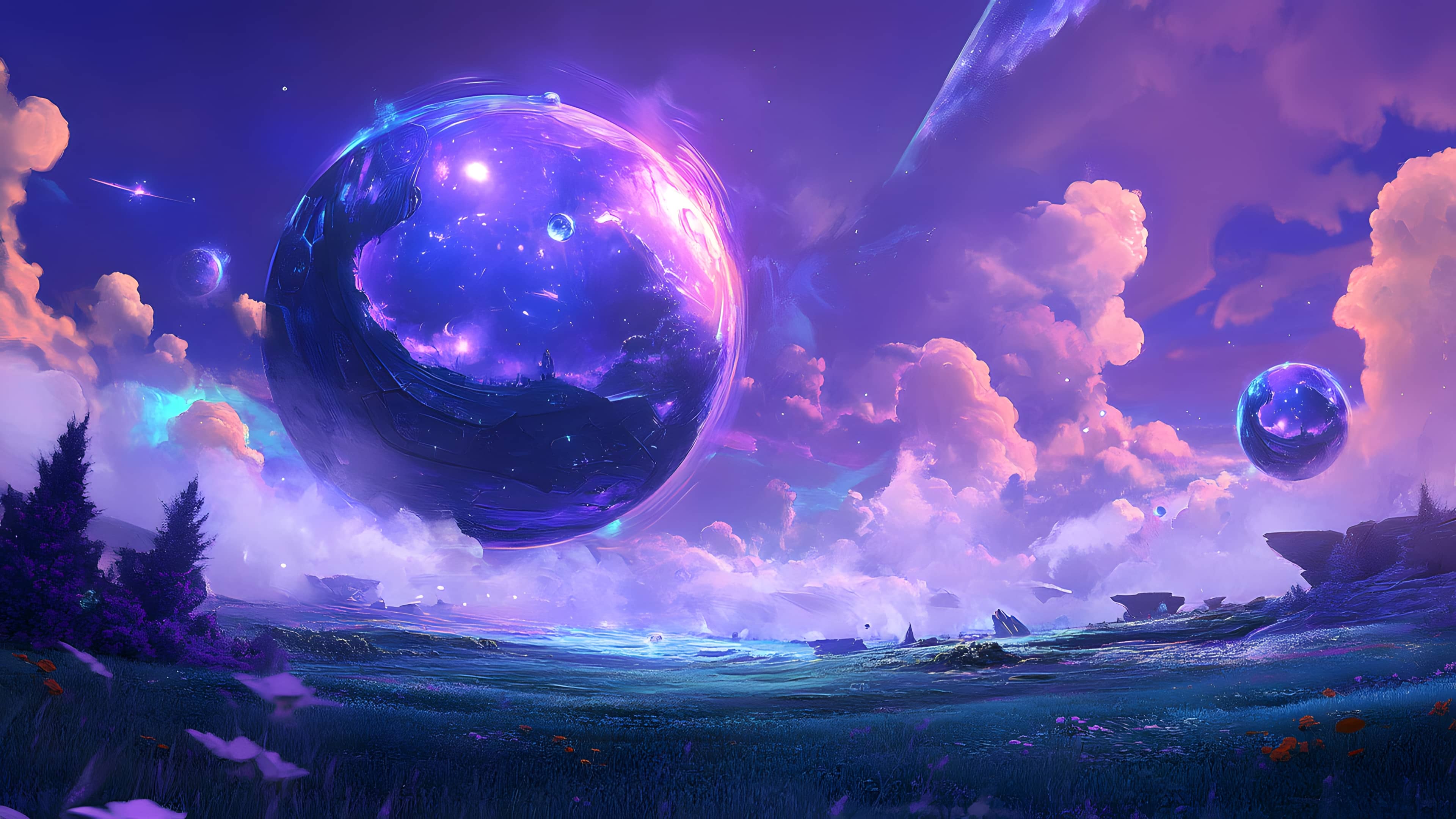 A mesmerizing fantasy landscape under a vibrant purple and blue sky, where glowing planets and cosmic orbs hover above an otherworldly field. The celestial glow, dreamy clouds, and otherworldly scenery evoke a sense of wonder and limitless imagination. Perfect for sci-fi and fantasy themes.