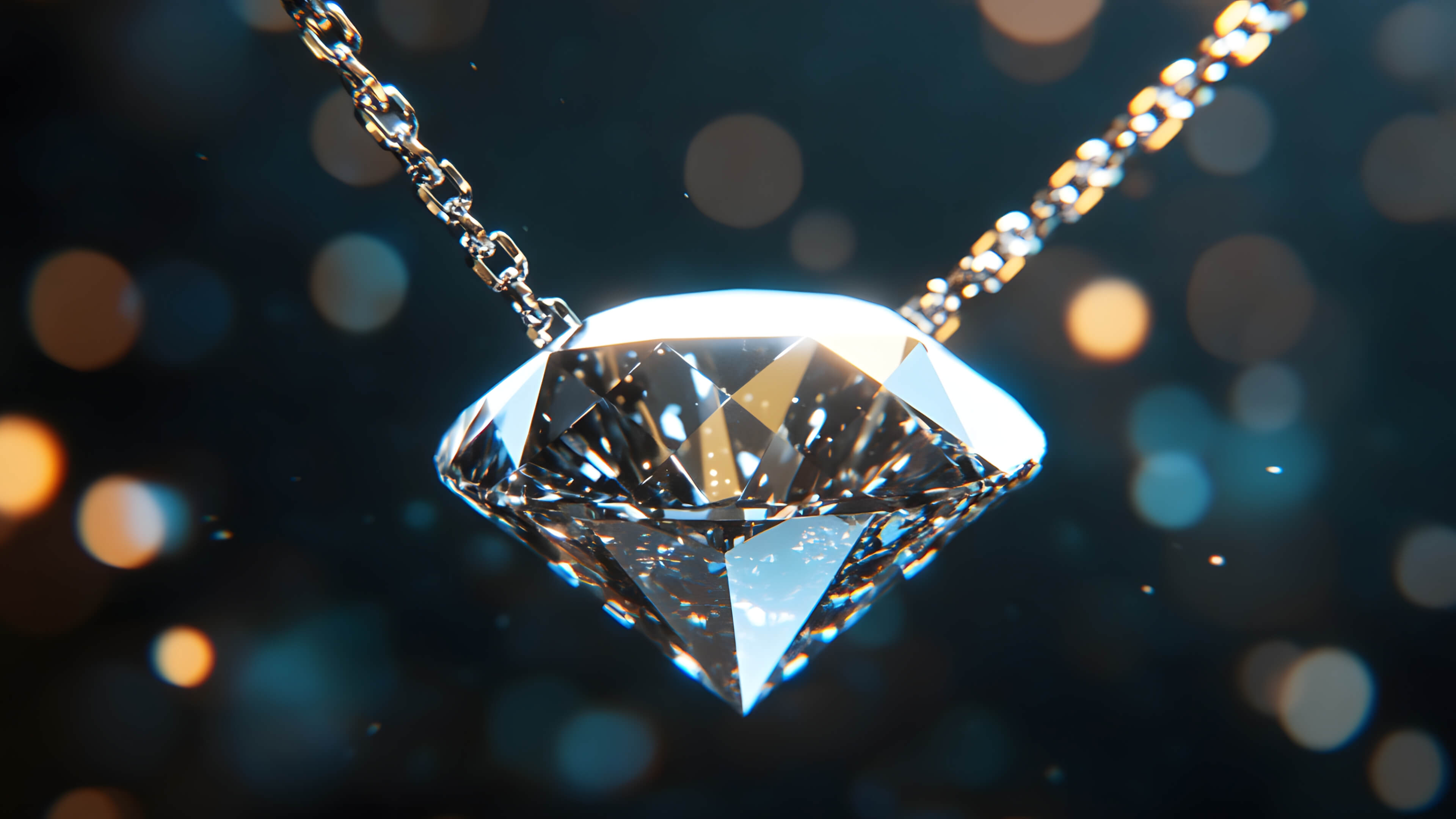 A luxurious diamond necklace that exudes brilliance and sophistication. This stunning close-up highlights the fine craftsmanship of the crystal-clear gem, elegantly suspended by a delicate chain. The glowing bokeh background adds a touch of mystery and charm, making this piece ideal for showcasing jewelry collections, luxury brands, or artistic concepts.