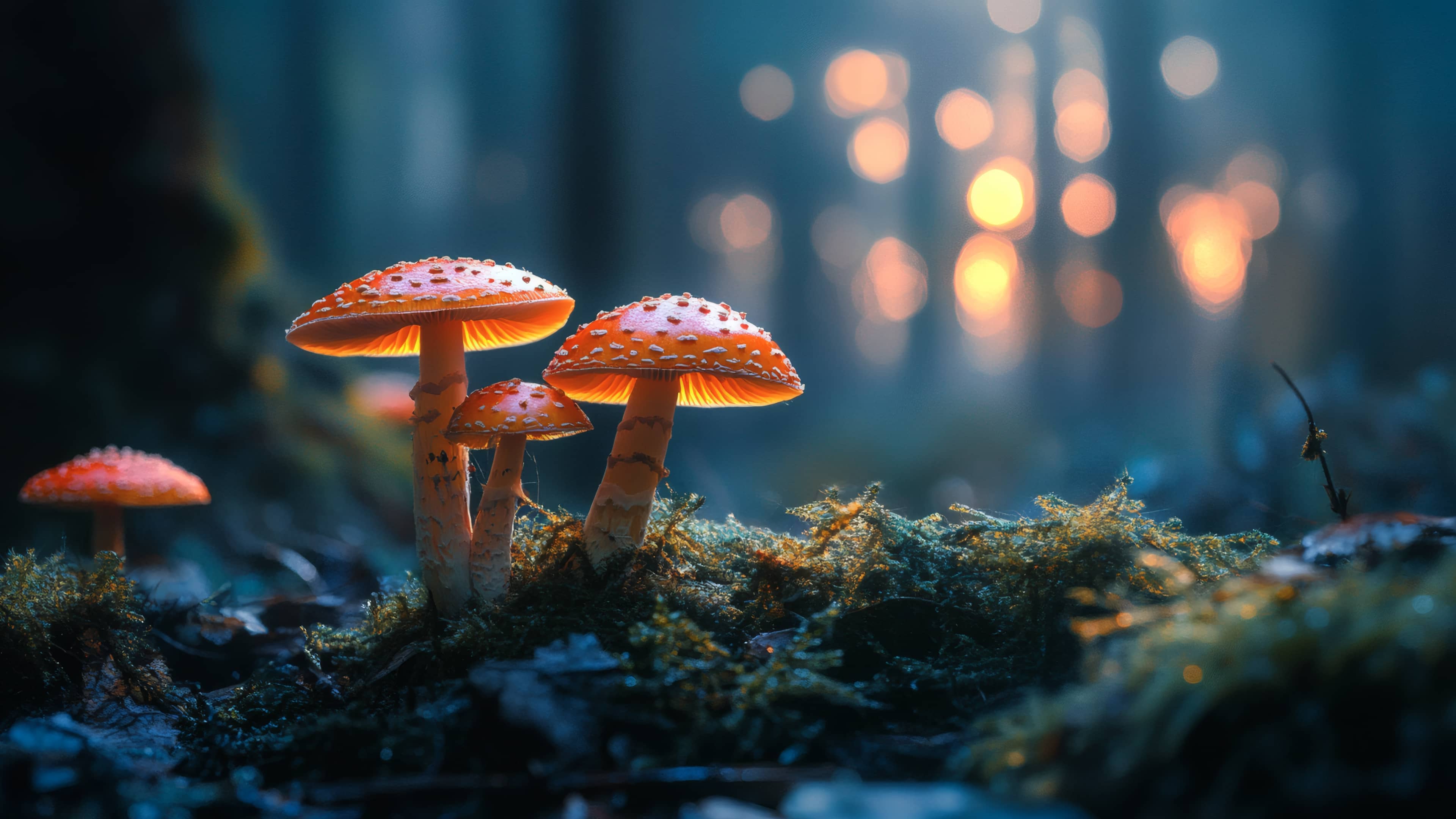 A magical forest floor scene featuring glowing orange mushrooms illuminated softly by the setting sun filtering through the trees. The scene showcases vibrant moss, earthy textures, and a dreamy bokeh background, creating an enchanting and whimsical atmosphere. The mushrooms, resembling the iconic fly agaric species, exude warmth and mystery, perfect for fantasy or nature-inspired visuals.