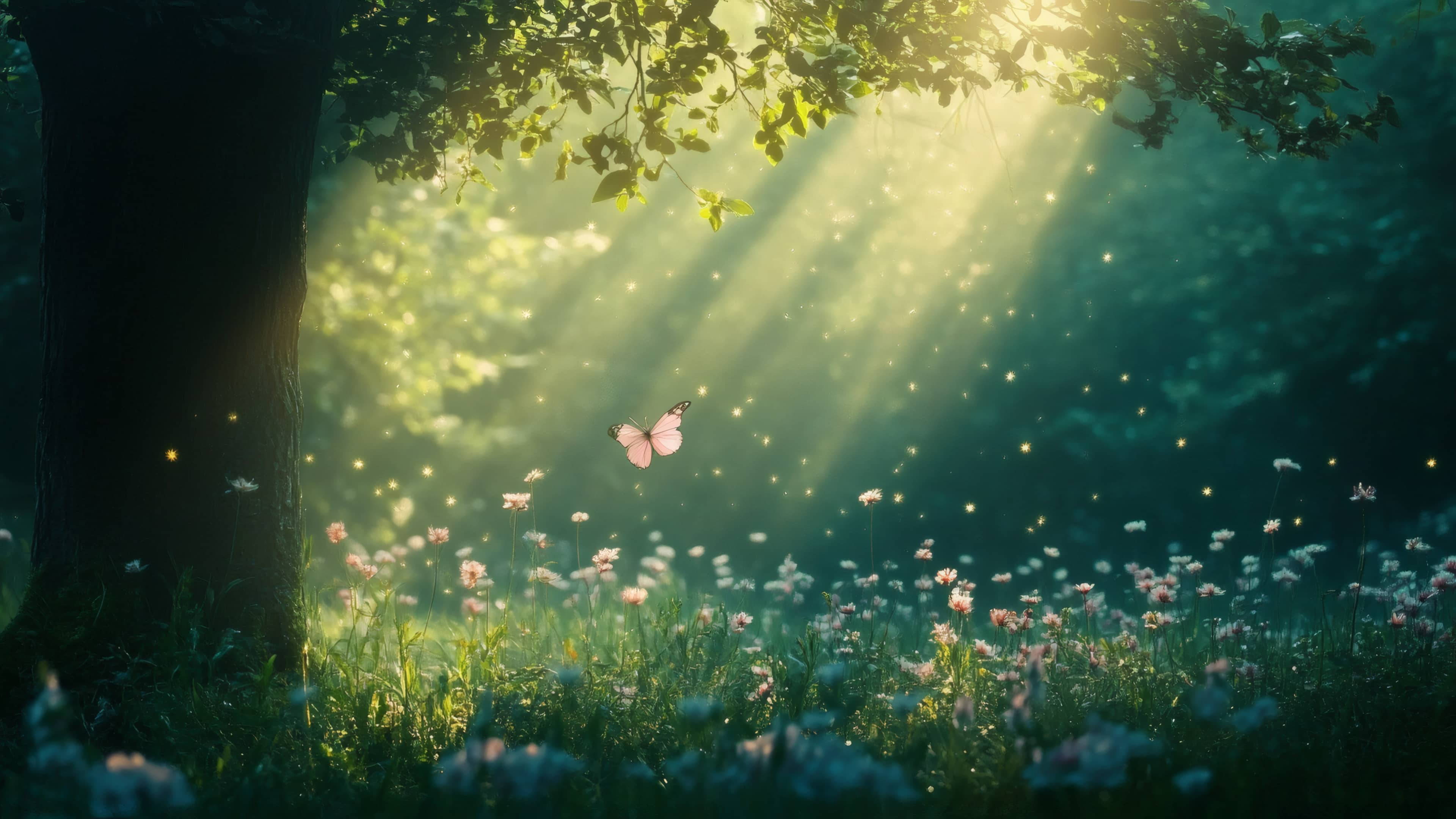 A magical scene of a butterfly gliding through a sunlit forest clearing, where beams of golden light illuminate wildflowers and floating particles of light. This serene and whimsical nature setting evokes fantasy, wonder, and tranquility, perfect for nature or fairytale themes.