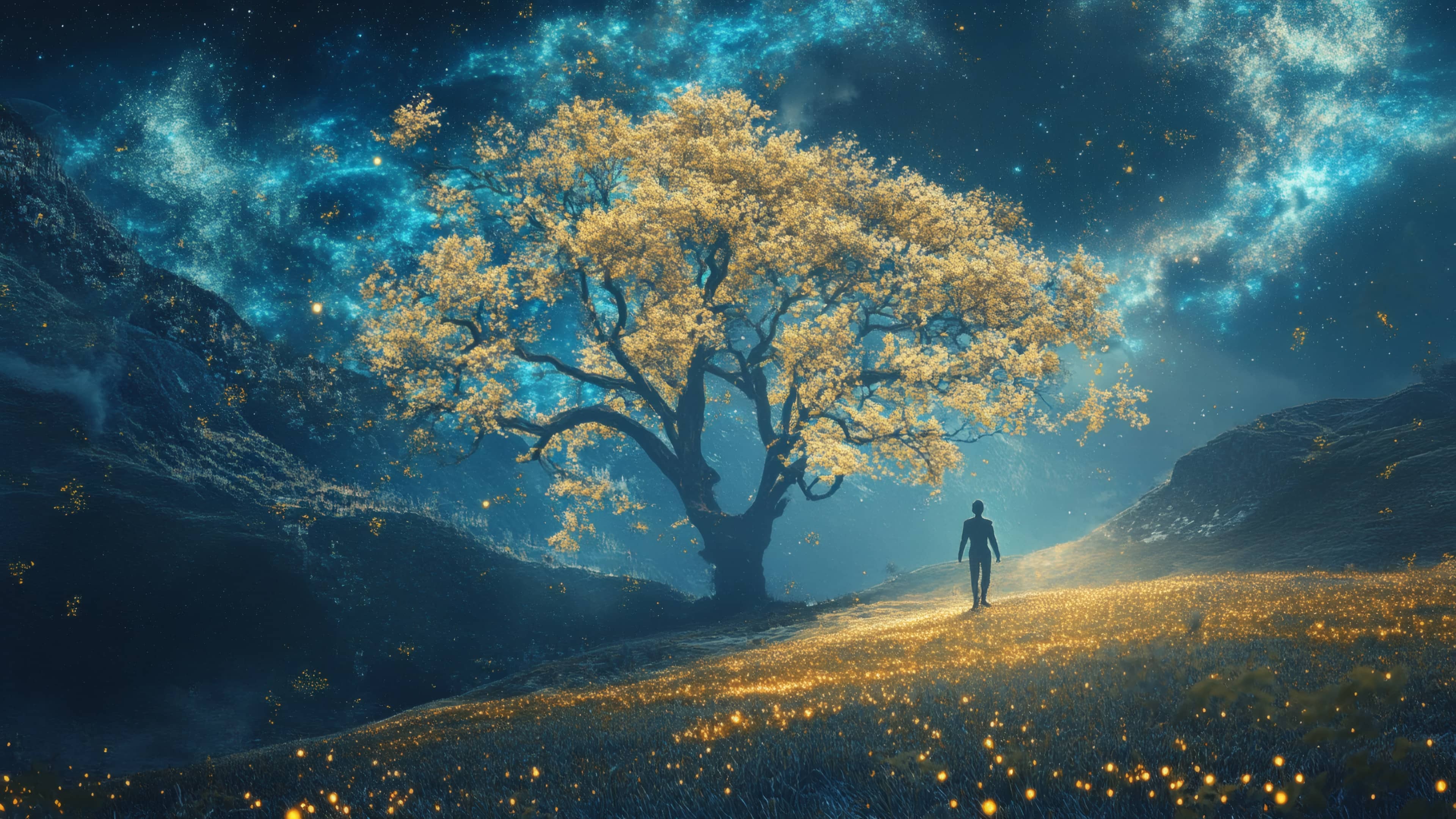 A mesmerizing scene of a glowing golden tree in a mystical landscape, surrounded by sparkling lights and a breathtaking starry night sky as a lone figure walks toward it.