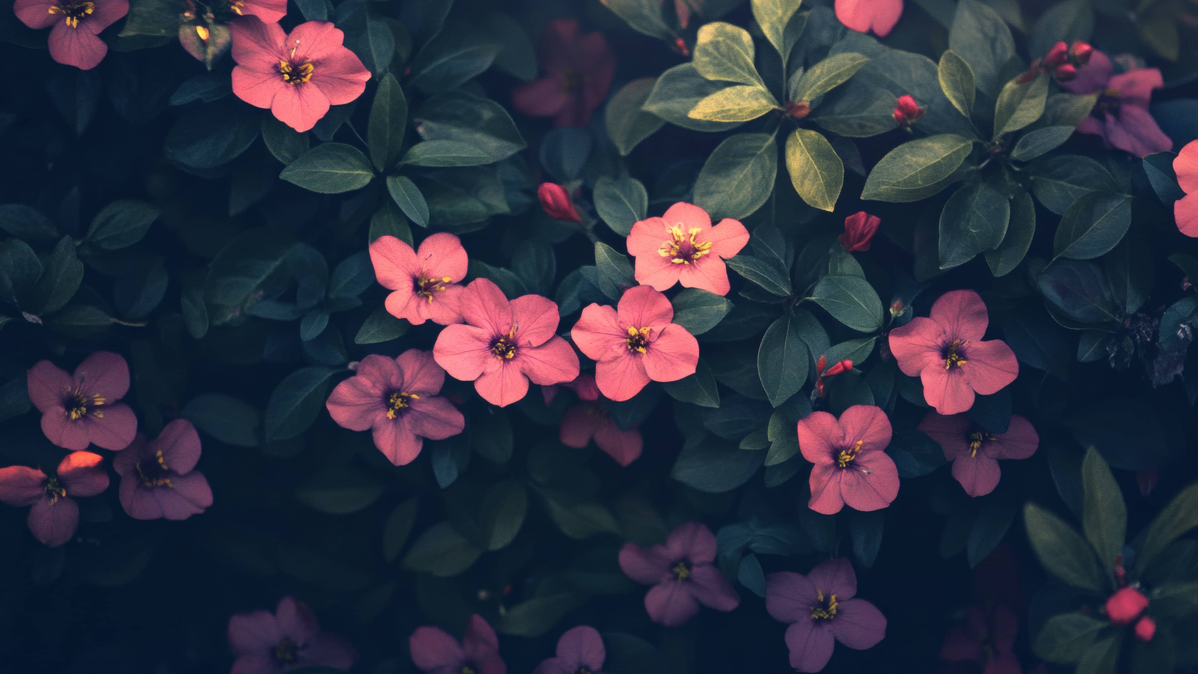 A mesmerizing view of vibrant pink flowers nestled within rich green foliage, creating a captivating contrast of nature’s beauty. This image exudes tranquility and warmth, perfect for themes involving nature, relaxation, and floral aesthetics.