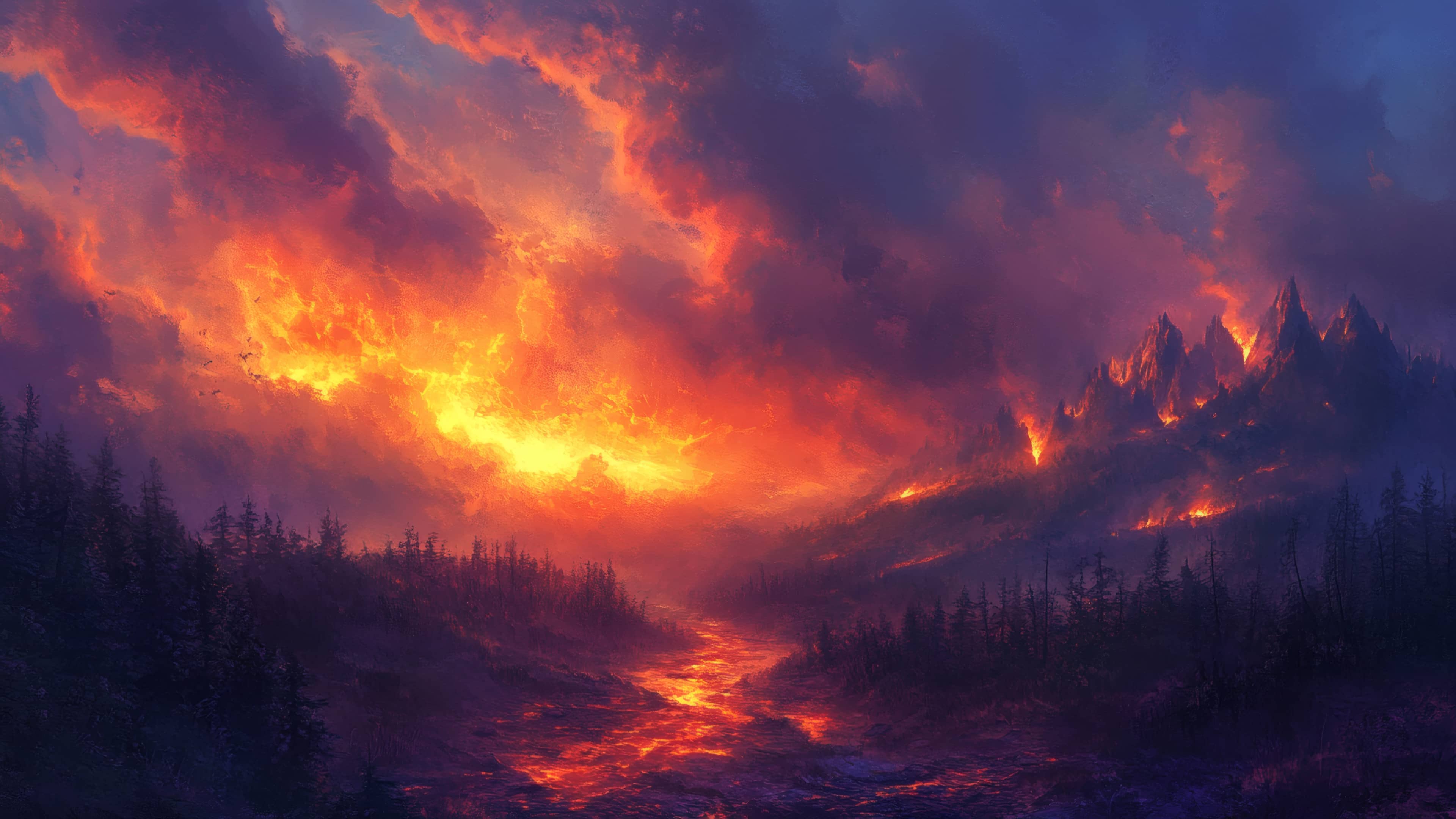 A dramatic, fiery landscape featuring towering mountains ablaze with molten fire under a glowing sunset sky. The river of lava flows through a dense forest, creating a vivid contrast of warm, fiery tones against the surrounding wilderness. Perfect for apocalyptic, fantasy, and nature-themed visuals.
