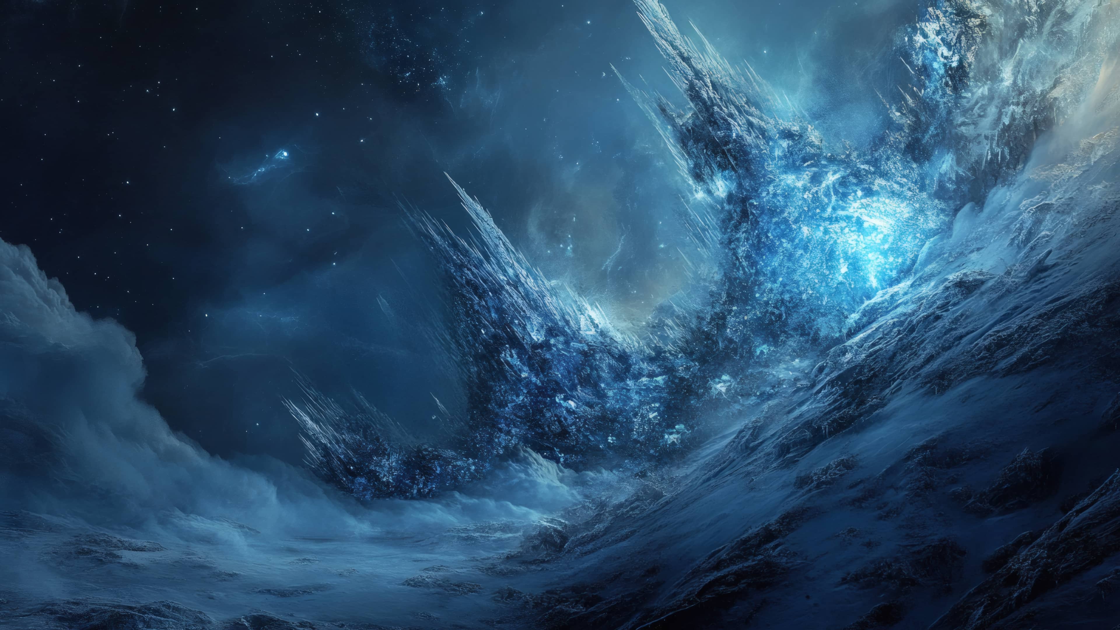 An otherworldly frozen landscape featuring jagged ice formations reaching toward a star-filled sky. The scene is bathed in a mysterious, glowing blue light that illuminates the icy terrain and creates a surreal atmosphere. Perfect for fantasy, science fiction, or adventure-themed projects requiring a mystical and cold environment.