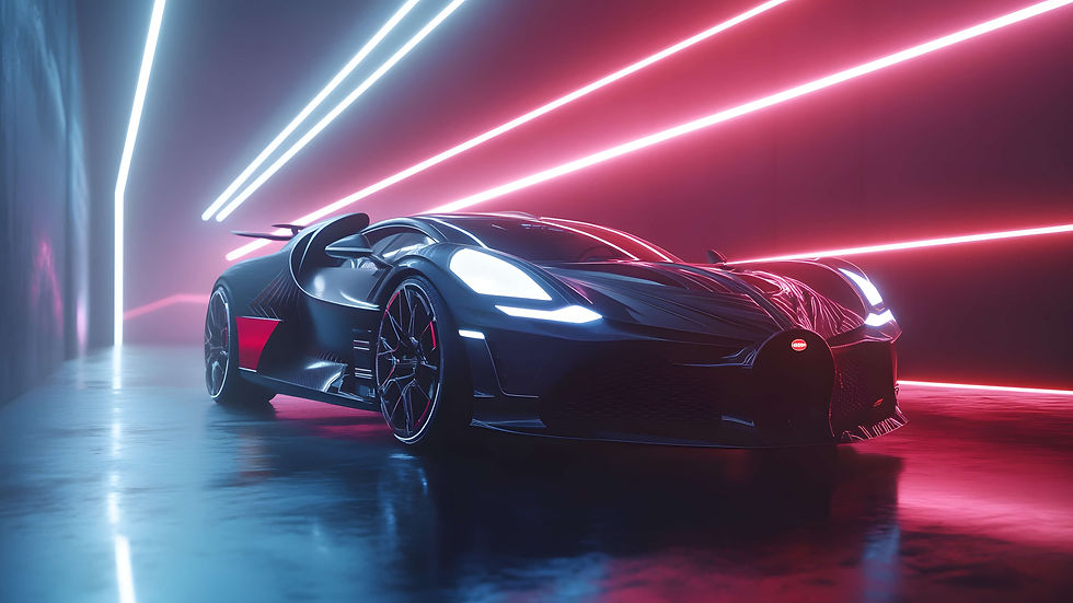 A stunning hypercar is showcased in a cyberpunk-inspired setting, illuminated by bold neon streaks of red and white. This sleek and powerful machine embodies the perfect blend of futuristic aesthetics and high-performance engineering, making it a dream ride for speed enthusiasts.
