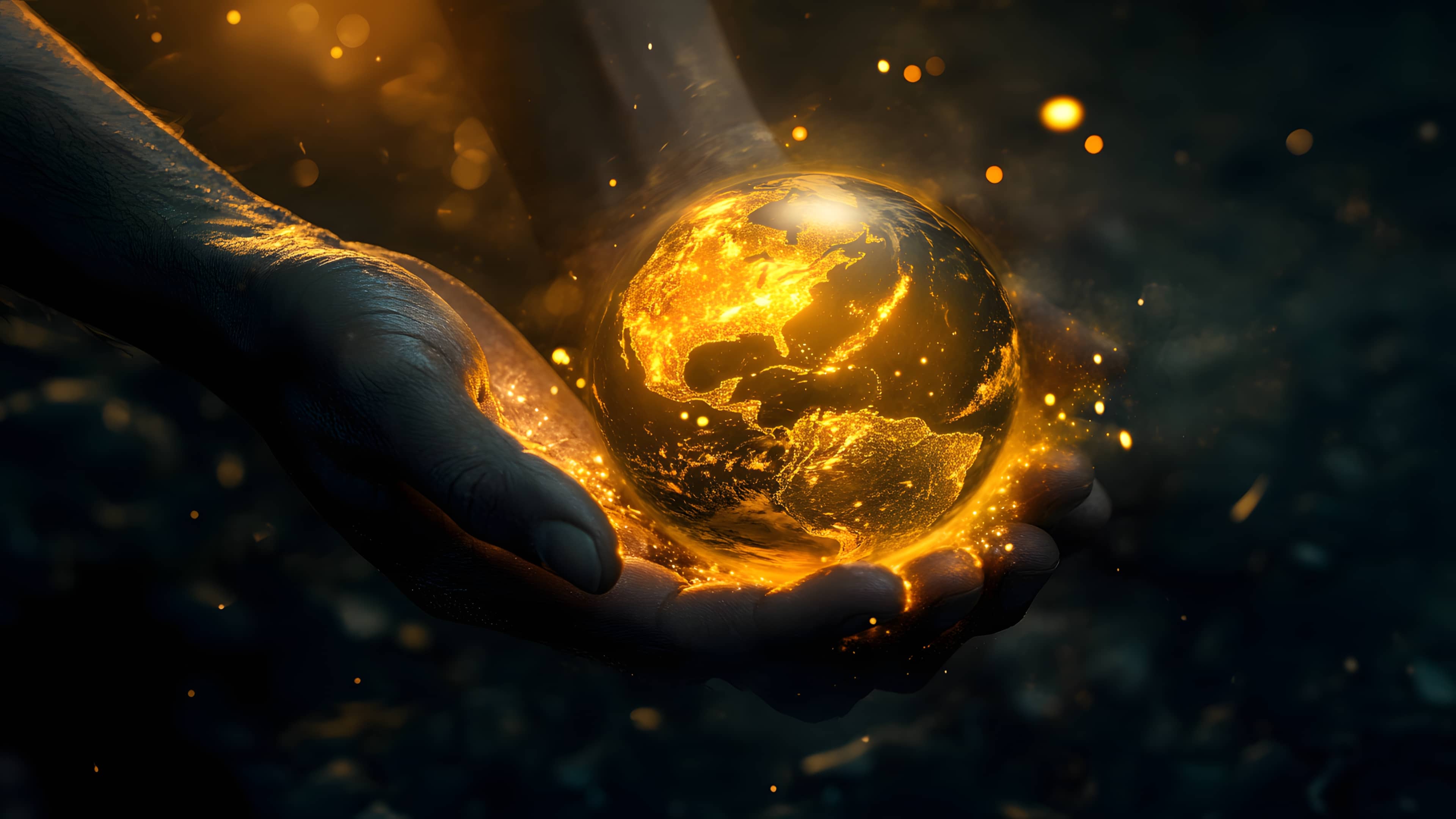 A radiant, glowing Earth gently cradled in powerful hands, symbolizing care, creation, and divine guidance. The warm golden light emanating from the planet reflects both cosmic energy and spiritual protection. A captivating representation of stewardship, faith, and the interconnectedness of all life.